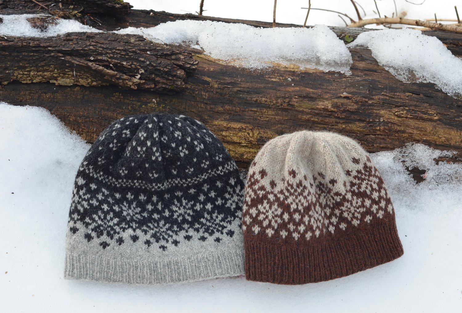 Hat B is shown in size Medium made with 1 skein each of Harrisville Designs Shetland (100% wool, 217 yards/50 grams) in colors Teak (MC) and Oatmeal (CC).