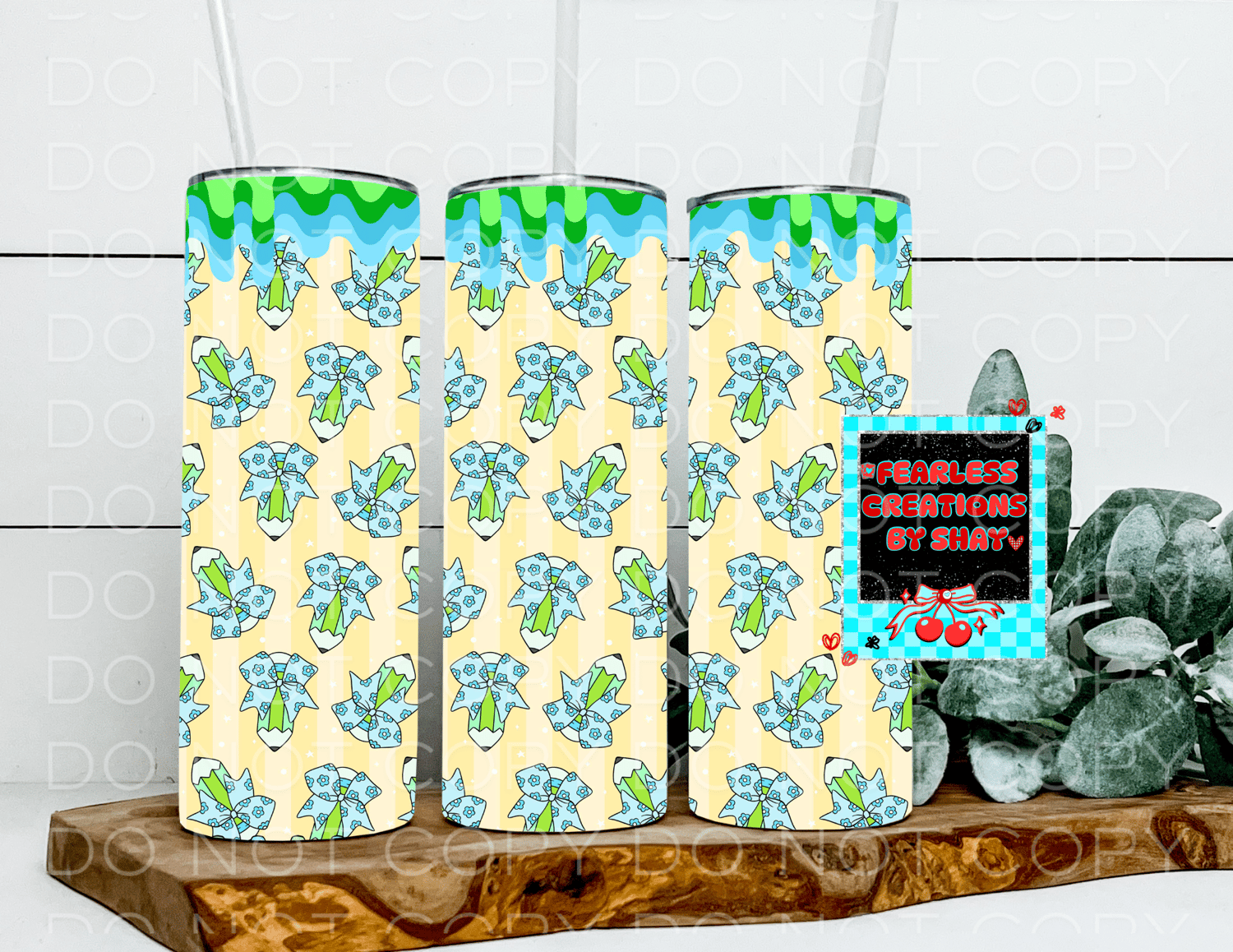 It holds 20 oz of your favorite beverage; has a plastic lid and comes with a reusable straw.