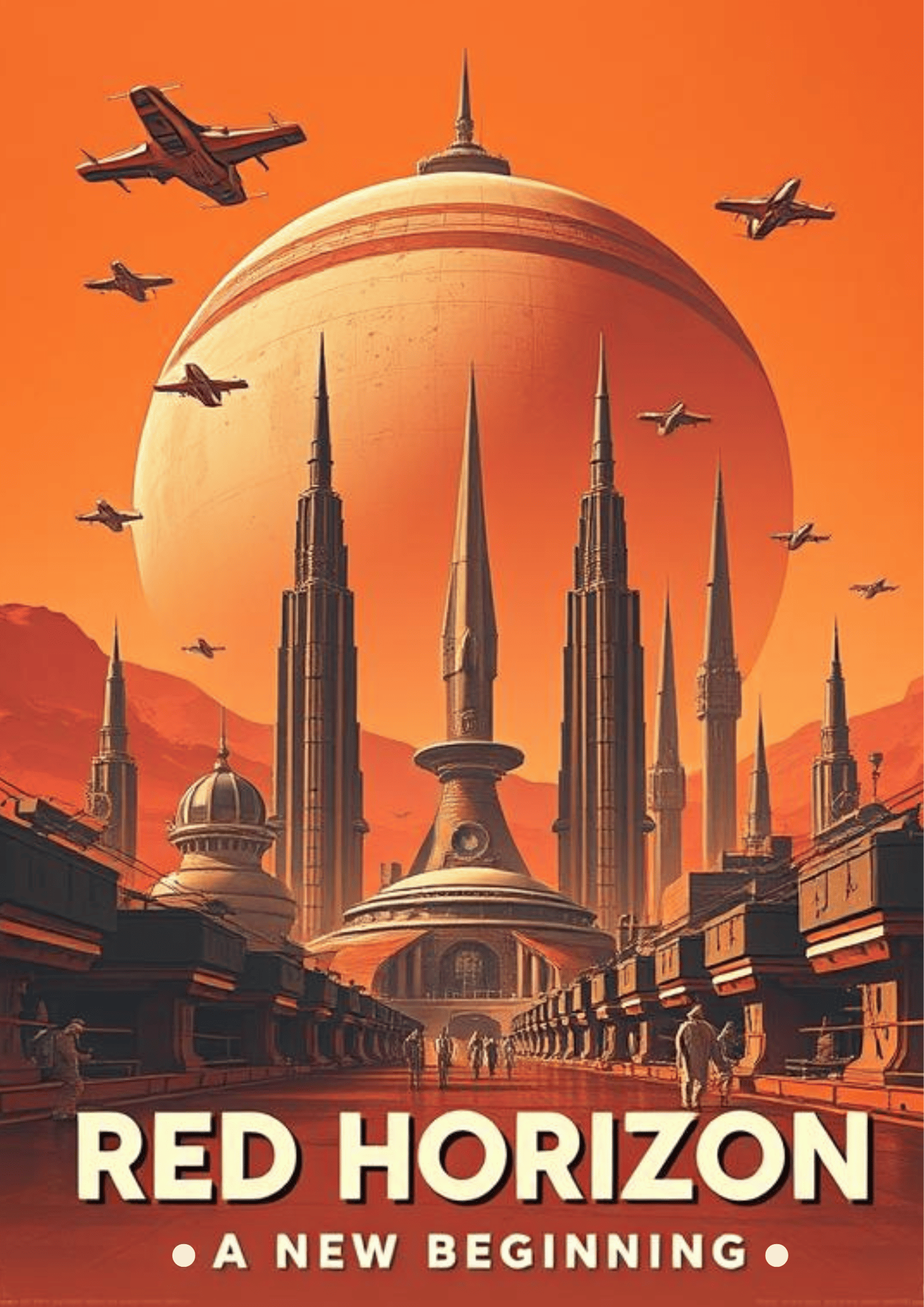 Step into the future with this 1950s retro-style space colony poster, featuring a breathtaking view of a Martian colony under a protective dome. Spaceships fly overhead while astronauts explore the red planet’s surface. The earthy tones and vintage colors evoke a sense of wonder and discovery, making this an ideal piece for sci-fi fans and explorers at heart.