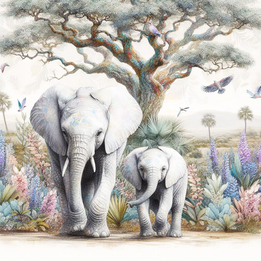 Colourful elephants beside a water hole & beautiful twisted patterned tree. There are humming birds, wild flowers a setting sun.