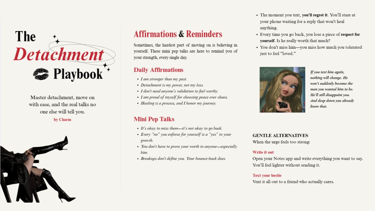 The Detachment Playbook is your no-BS guide to letting go, moving on, and choosing yourself. Inside, you’ll find real talks, practical steps, journal prompts, affirmations, and gentle healing practices. Healing isn’t linear, but this guide makes it easier. ✨