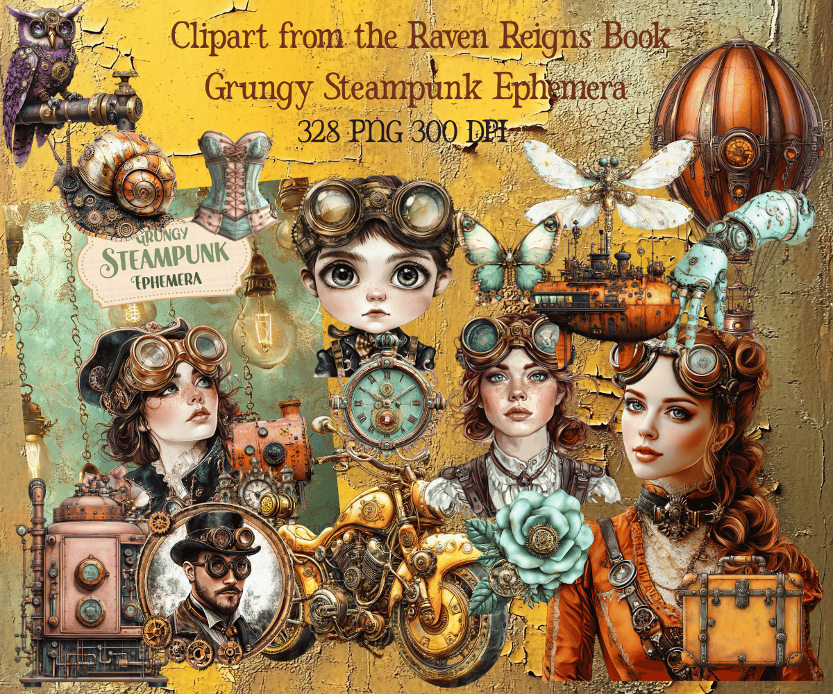 This is the entire package of clipart elements and backgrounds from Raven's Grungy Steampunk Ephemera to Cut and Collage Book. You will get: