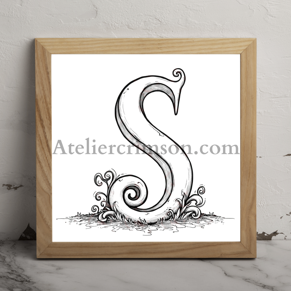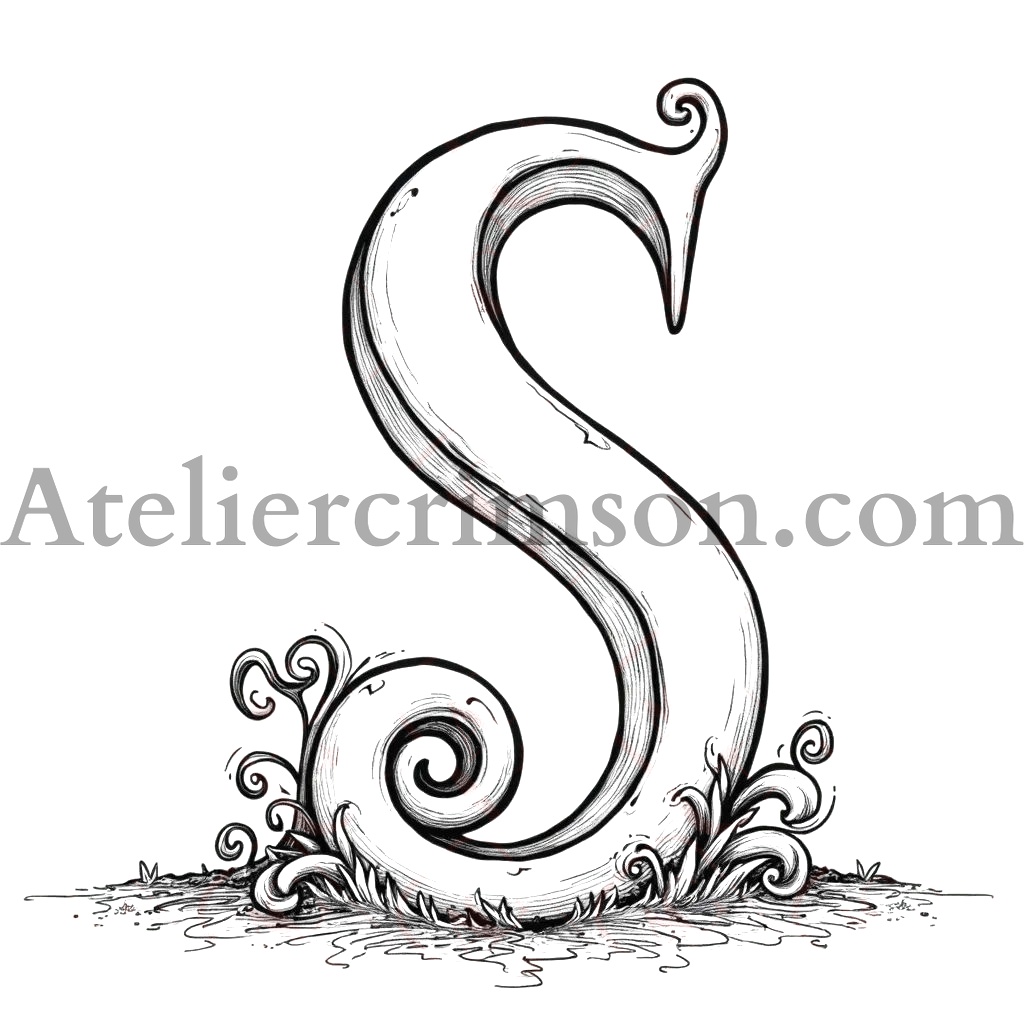 The letter S colloring book jack halloween Tim Burton-inspired alphabet art. Spooky-cute character in coloring book style. Perfect for Halloween crafts or gothic decor.