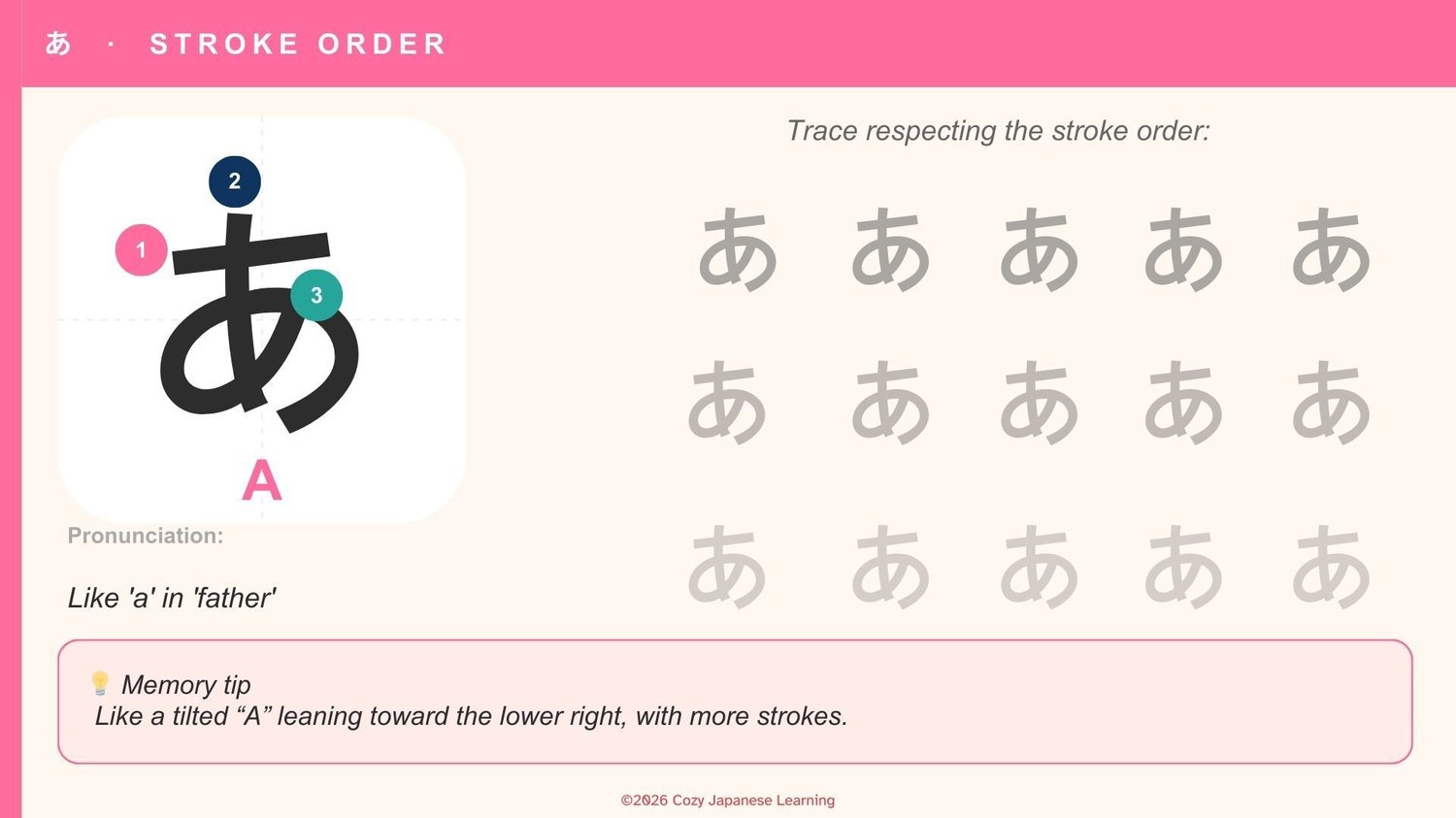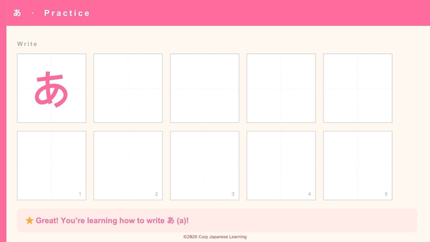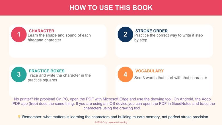 Hiragana Made Simple works however you work best. Print it out at home or at a local print shop and practice with a pen or pencil the traditional way — which is one of the most effective methods for memorizing writing systems. Or use it digitally on a tablet with a stylus and trace directly on screen. Either way, everything you need is already on the page.