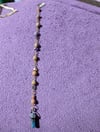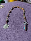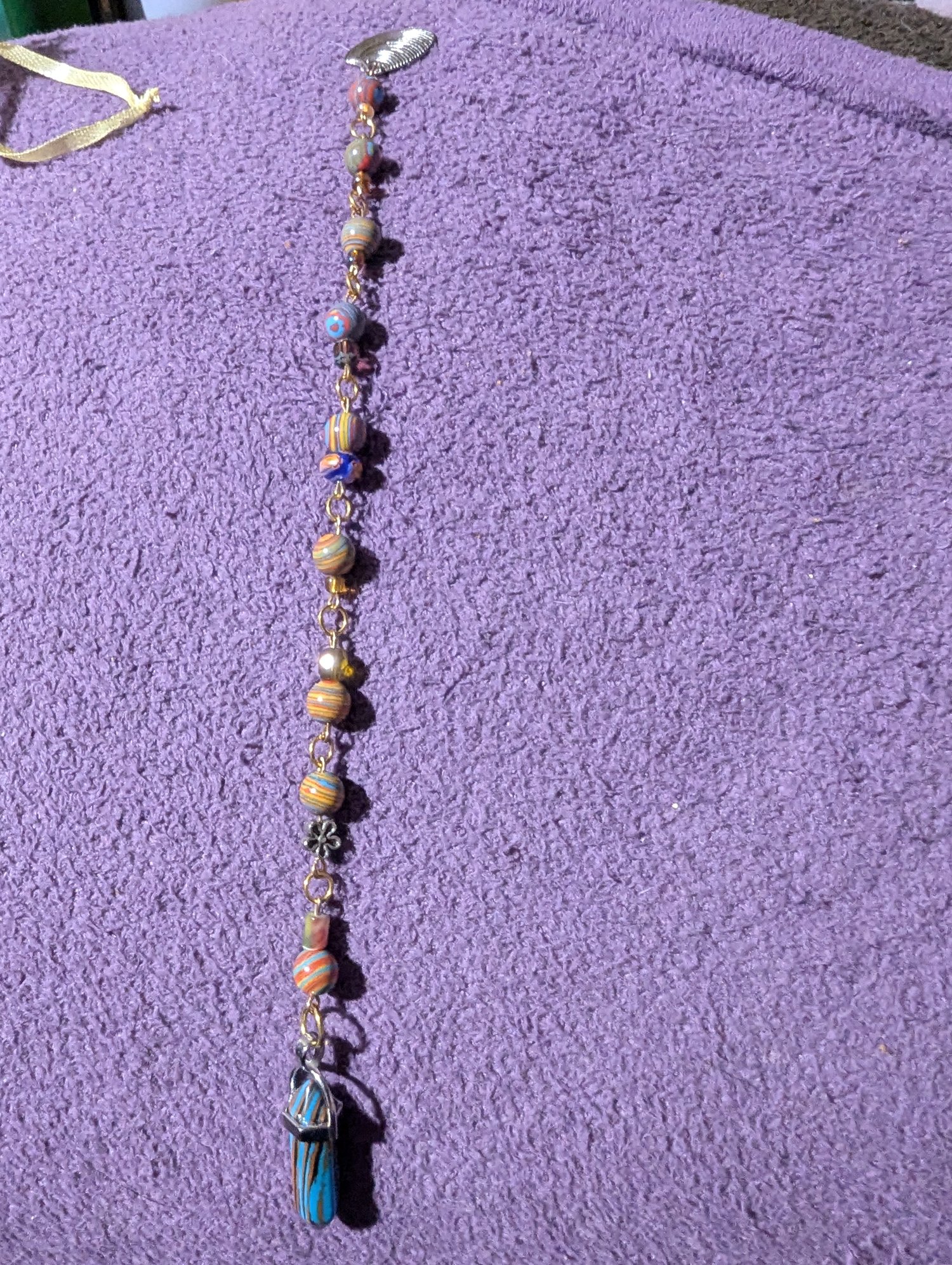 Hand beaded glass and metal pendulum, with seashell charm for easier holding. The beads are all swirled with blue, red, green and brown tones, while the pendulum point itself includes black streaks among the other colors. One of a kind, no pattern used.