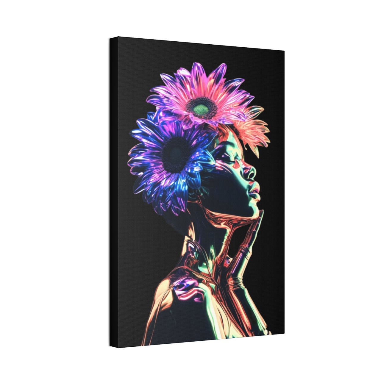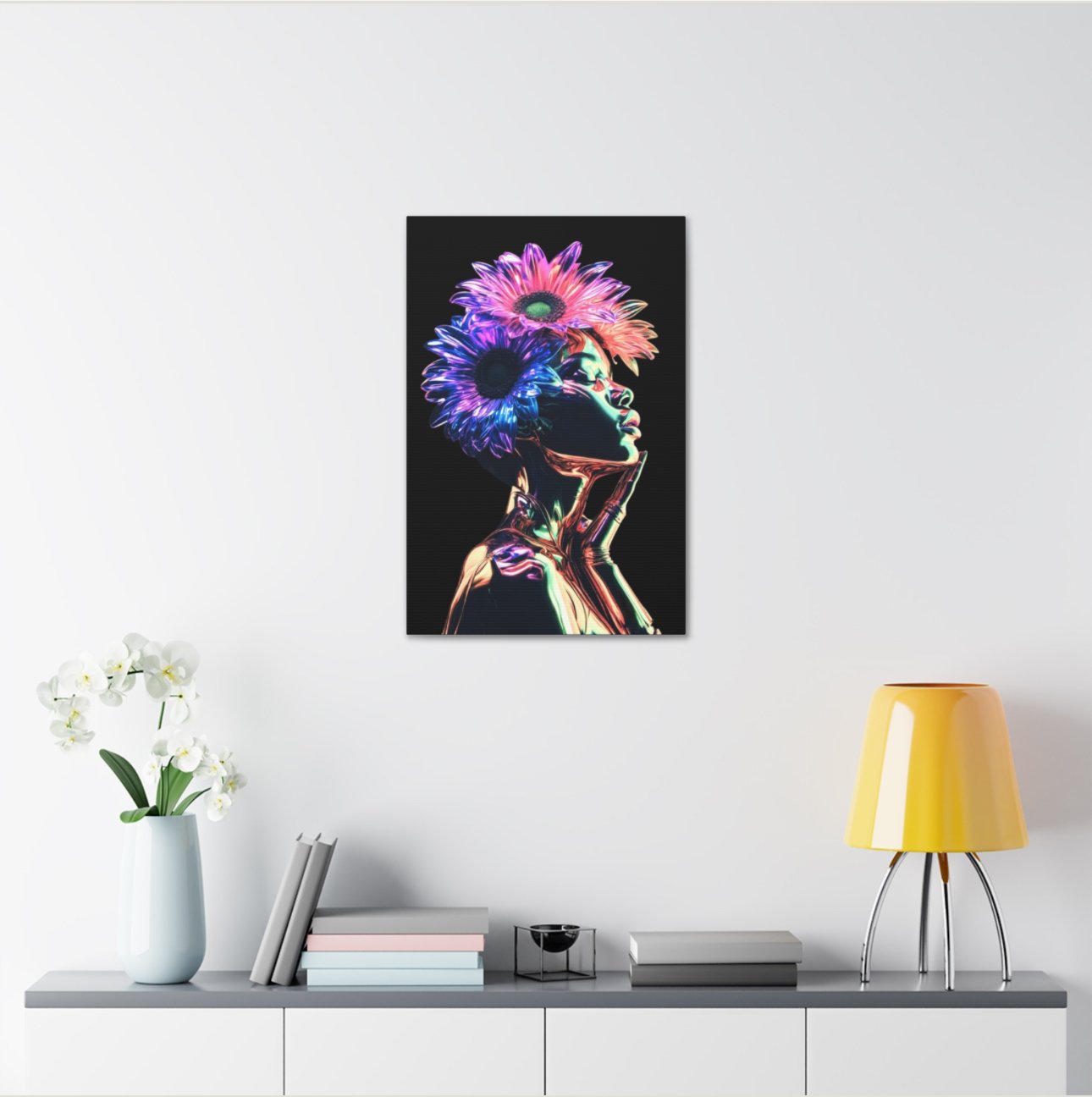 Step into a realm where imagination blossoms and color sings. "Vivid Reverie," a breathtaking jewel from our "Neon Naturescapes" collection, invites you to immerse yourself in its profound beauty. Imagine the figure's serene profile, bathed in an otherworldly glow, crowned by a majestic cascade of iridescent flowers that seem to float in a dreamlike dance. This is more than a canvas print; it's an enchanting glimpse into a vibrant inner world, designed to transform your space into a haven of tranquil beauty and inspiring contemplation, sparking wonder with every glance.