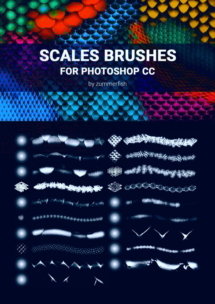 Scales 2.0 brush pack upgrades an older Scales pack. It adds 20 new dynamic scales brushes to the set. All brushes from the legacy pack are available as well.