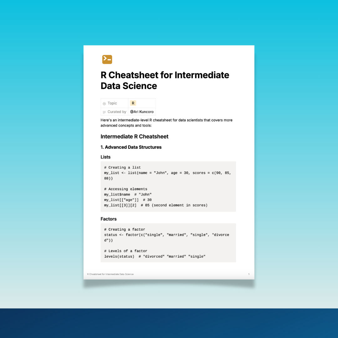 Boost your data science skills with our essential R Cheatsheet. Perfect for beginners and intermediates, it simplifies data manipulation, visualization, and analysis. Accelerate your learning and career—get your cheatsheet today!