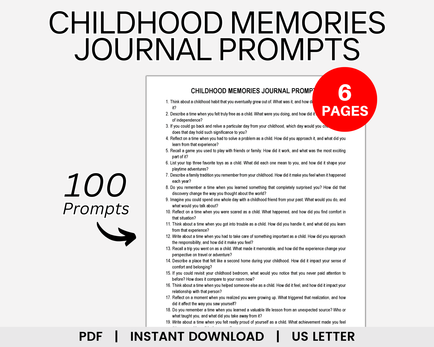Take a trip down memory lane with these childhood memories journal prompts. Reflect on the moments that shaped you and connect with the joy, curiosity, and innocence of your younger years. These journal prompts for childhood memories spark meaningful self-reflection and offer a fun way to reminisce about favorite games, family traditions, and unforgettable adventures. Revisit the feelings and experiences that helped form who you are today. Perfect for anyone looking to reconnect with their past, these prompts provide a thoughtful way to relive cherished memories and discover new insights along the way.