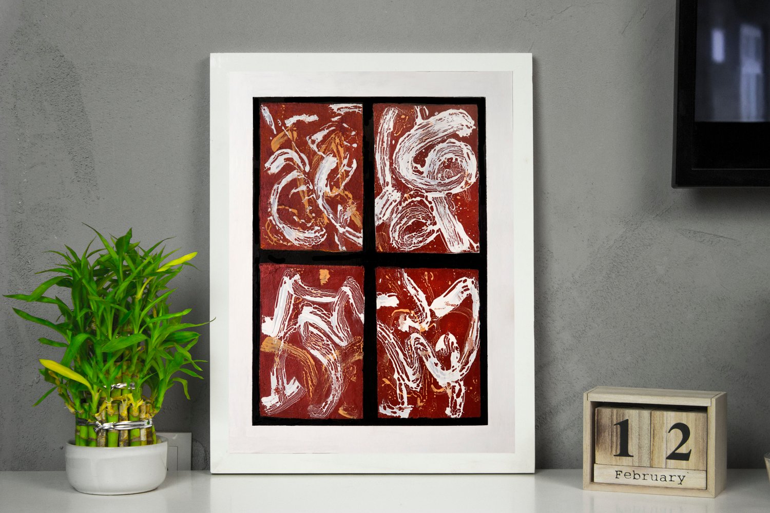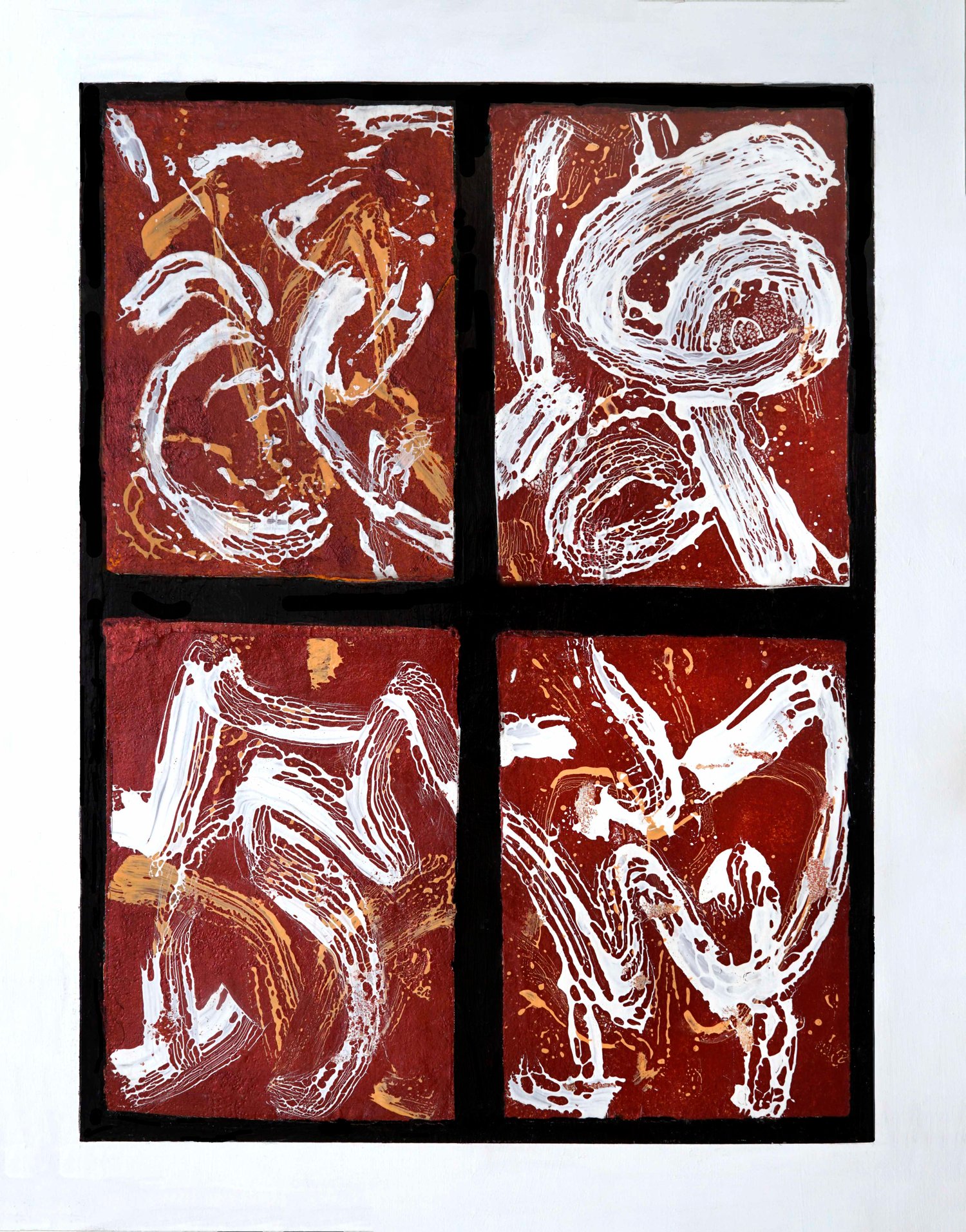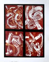 Dragon God is an experimental mark-making project that had four separate pieces brought together as one painting that is now ready to frame and hang.
