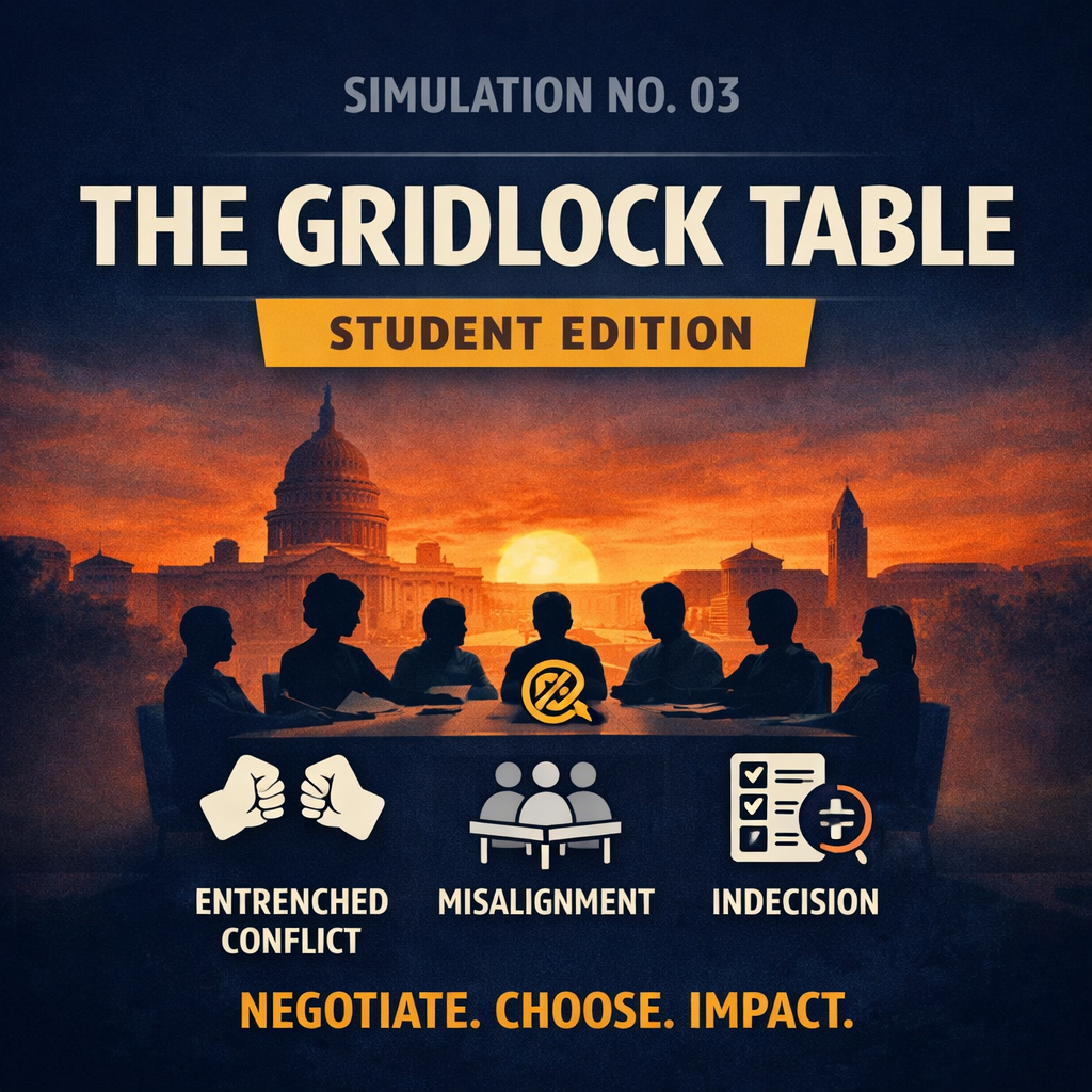Simulation 03 — The Gridlock Table (Student Edition) is a decision-making simulation that reveals why teams struggle to turn disagreement into action. Participants operate inside a structured system where authority is shared, incentives are not fully aligned, and decisions must be made under time pressure. What emerges is not conflict—but gridlock: repeated discussion, delayed decisions, and lack of closure.
