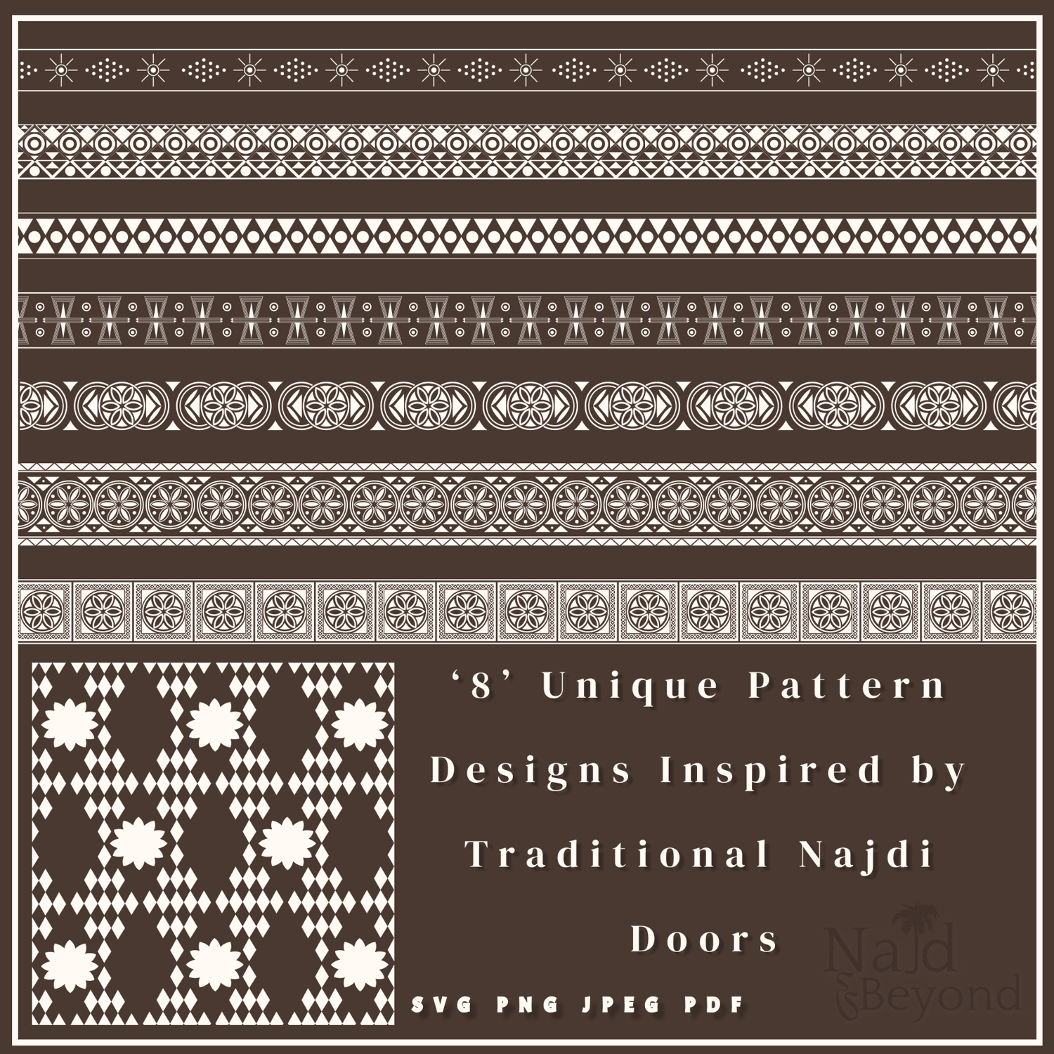 Discover a unique collection of 8 repetitive pattern designs inspired by the artistic details of Najdi traditional doors. Each pattern has been carefully crafted by me to reflect the beauty of Saudi heritage while being versatile enough for modern creative projects.