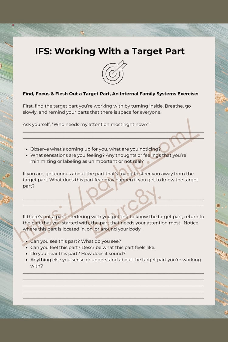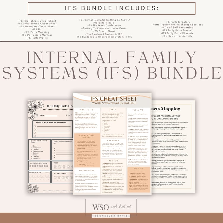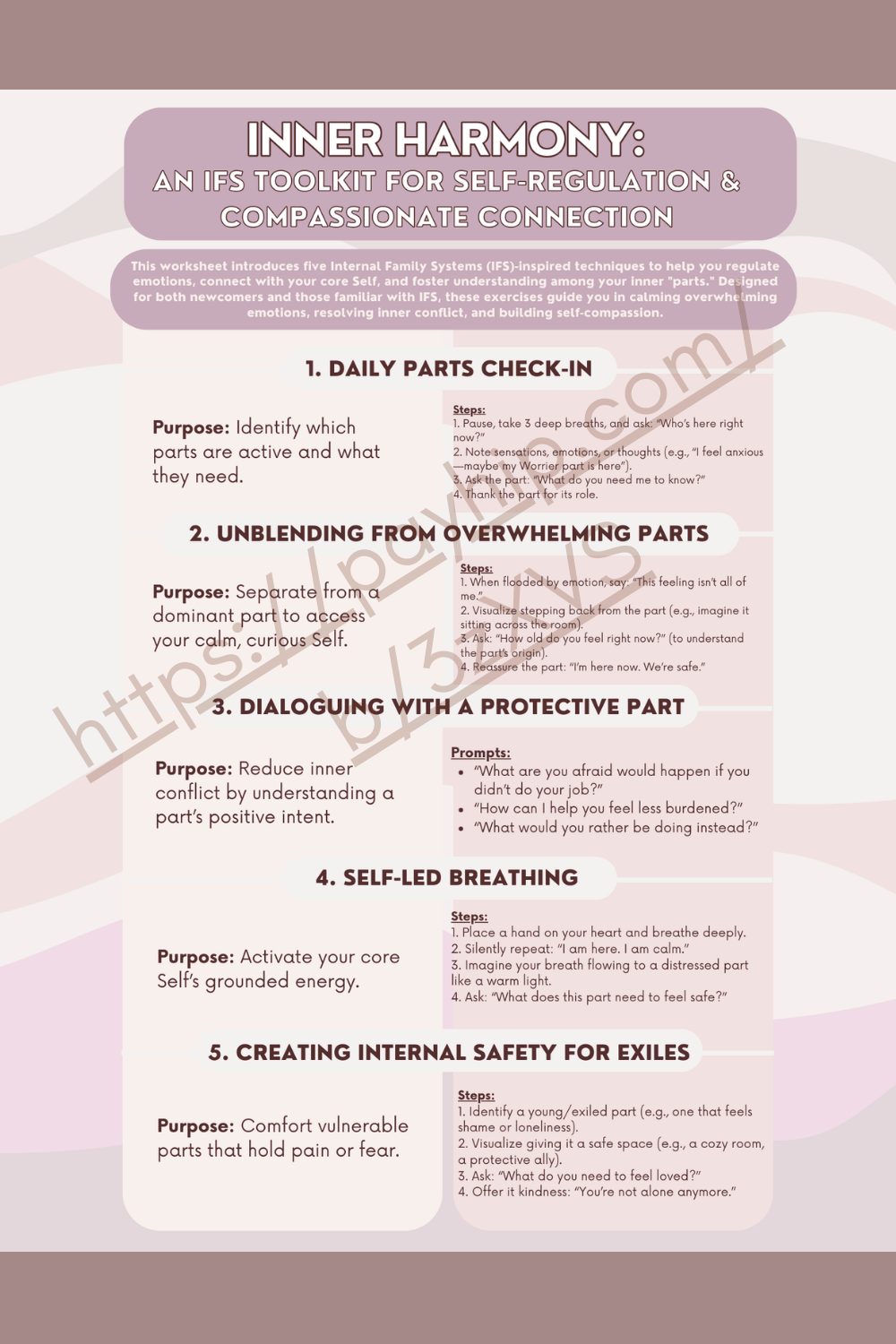 This worksheet introduces five Internal Family Systems (IFS)-inspired techniques to help you regulate emotions, connect with your core Self, and foster understanding among your inner "parts." Designed for both newcomers and those familiar with IFS, these exercises guide you in calming overwhelming emotions, resolving inner conflict, and building self-compassion.