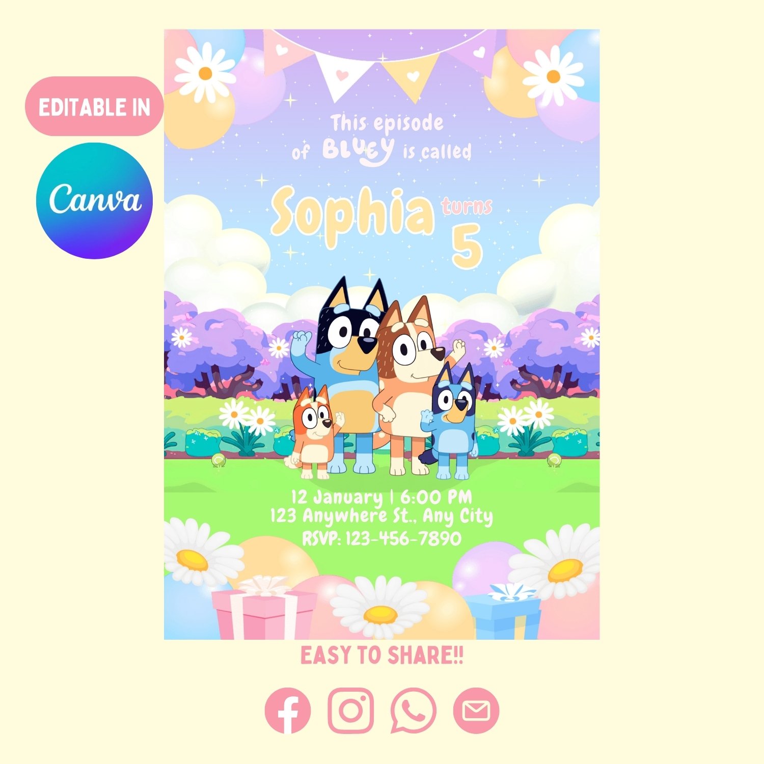 Invitación de Cumpleaños Editable Bluey Tornasol (Canva)