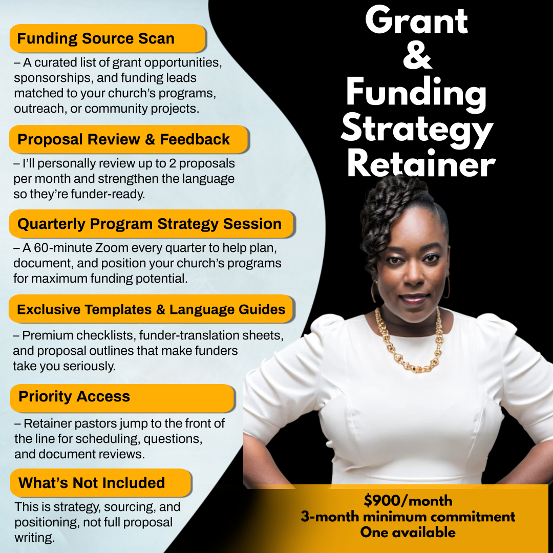 That’s why I created the Grant & Funding Strategy Retainer, a premium partnership designed to keep your church grant-ready, all year long.