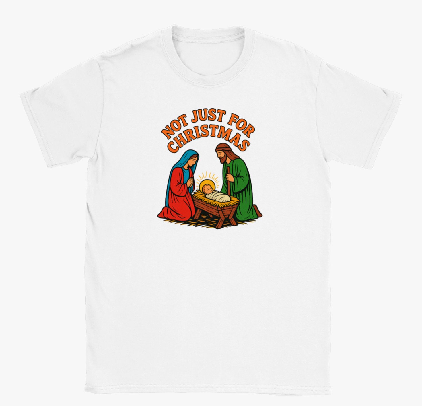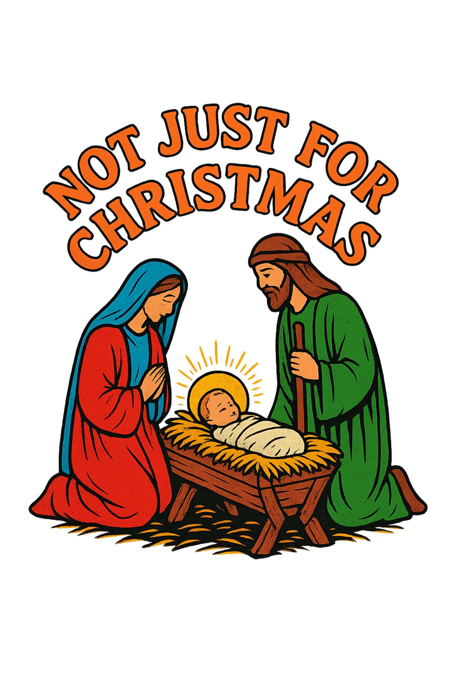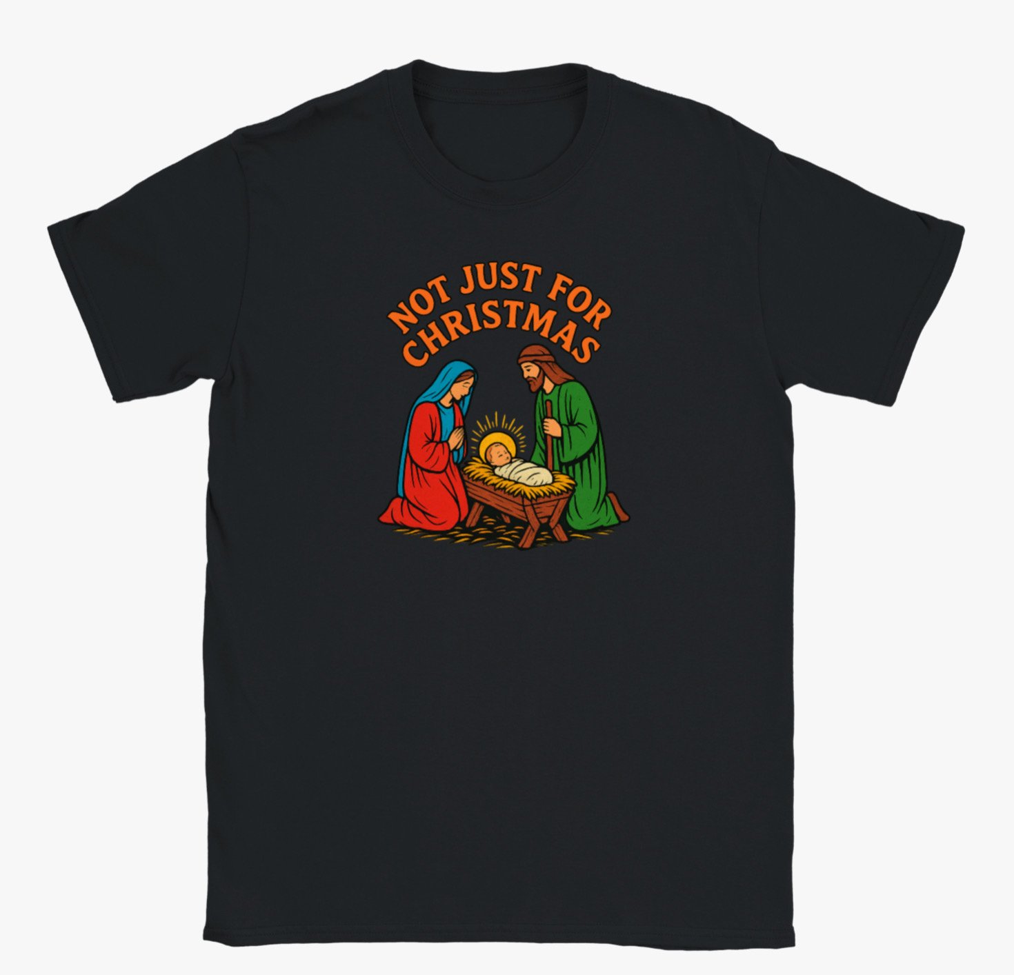 Celebrate the true meaning of Christmas all year round with our “Not Just For Christmas” t-shirt. Featuring a beautifully illustrated nativity scene with Mary, Joseph, and baby Jesus, this design reminds us that faith, love, and hope aren’t just for the holiday season.