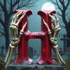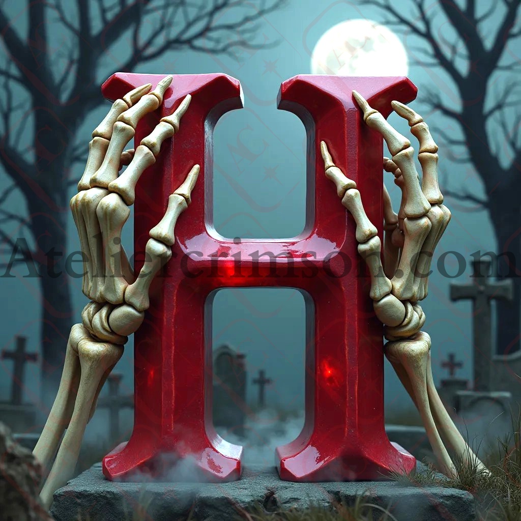 The letter H ruby halloween skull Discover our eerie alphabet series featuring photorealistic ruby letters and numbers. Each character, crafted from deep red gemstone, floats mysteriously in a misty graveyard. Skeletal hands frame these gleaming symbols against a moonlit, Halloween-inspired backdrop. Perfect for gothic design projects or seasonal decor inspiration!