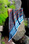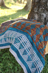 This design is an asymmetric shawl with slipped stitches and colorwork, easily customizable using three colors. Great accessory for autumn and wintertime.