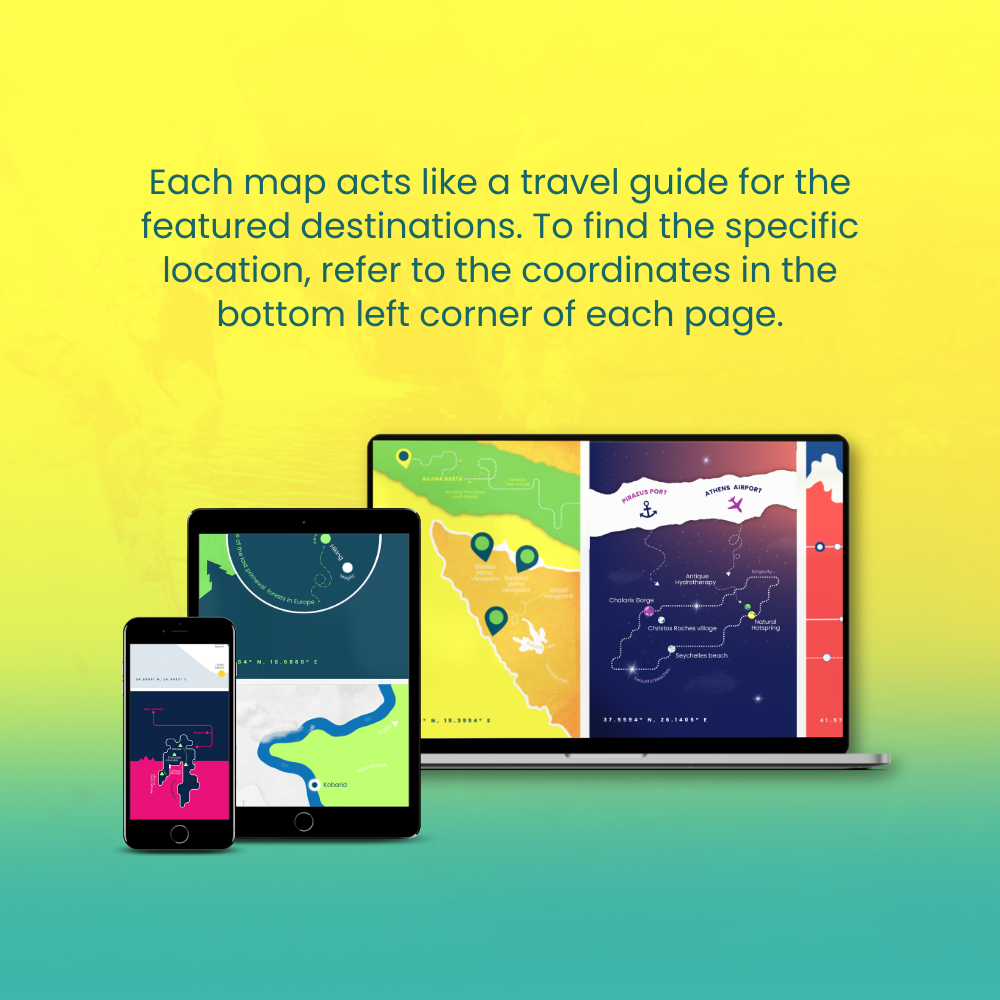Maps act as a visual travel guide for exploring the highlighted destinations. To find the specific location, refer to the coordinates in the bottom left corner of each page.