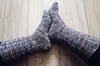 (Note the photo to the right shows the Socks with the Spine Cable on the Left sock and the Fishtail Cable on the right Sock – please see photos on pattern page for additional pictures)