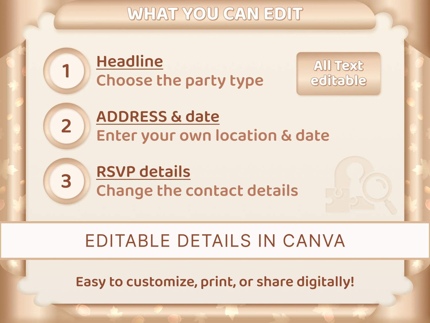 2. Edit in Canva β Personalize text fields in minutes (date, time, location, RSVP).