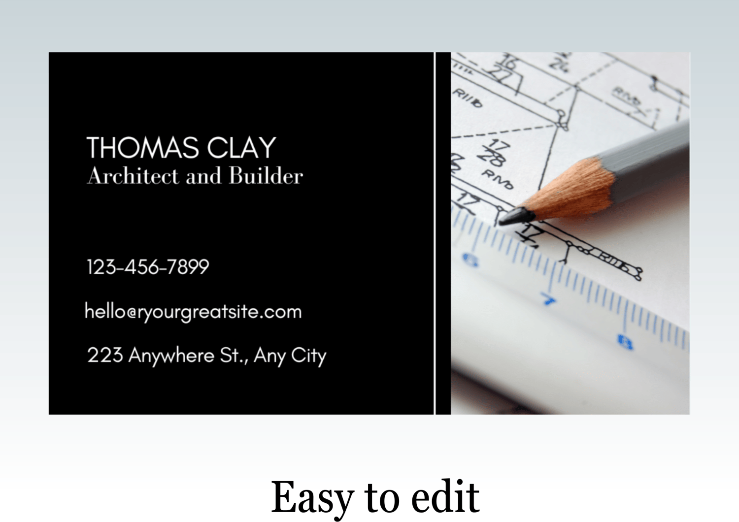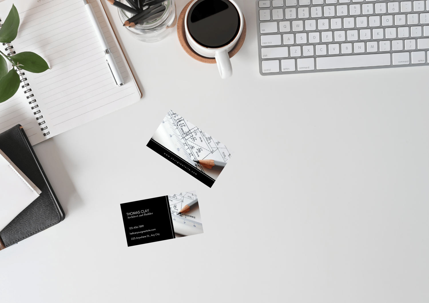 Architects Construction Modern Black & White business card, with an architect’s Work photo of an architect’s working tools, a pencil, and a ruler, on top of plain paper on the front of a business card