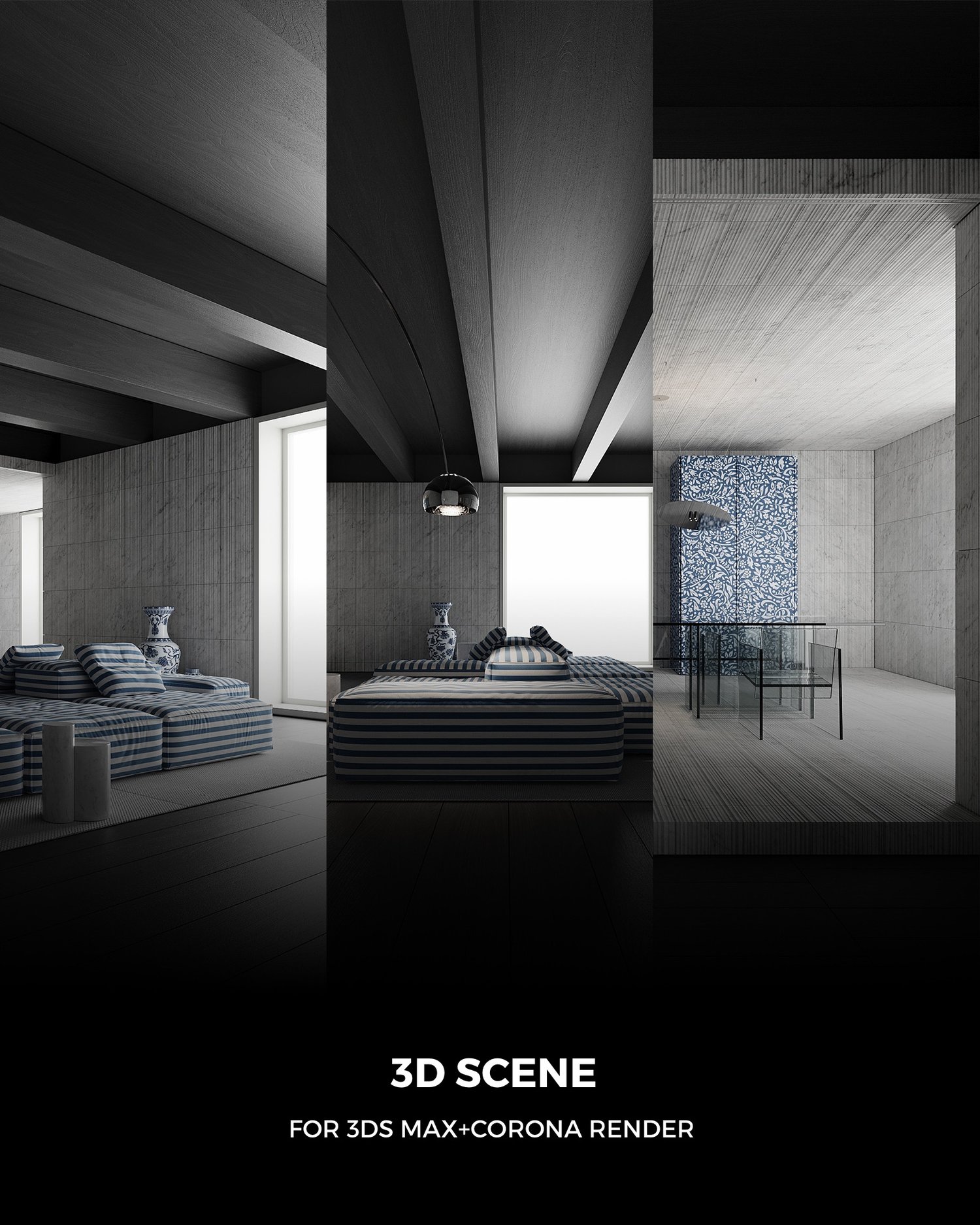 3D scene made in 3Ds Max + Corona Render, with customized lighting and materials. The scene is worked out and assembled with incredible detail, clarity and accuracy. Saved all lighting settings, textures, furniture details. This is an incredibly useful tool for designers and visualizers who want to improve their skills and level up their work in 3Ds Max 2018-2024 + Corona Render 8. Enjoy!