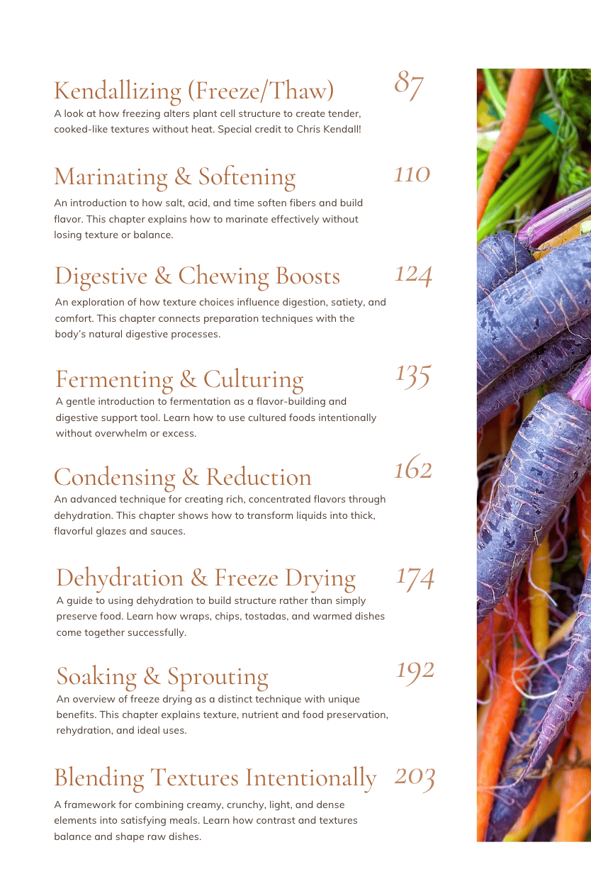 This book is a deep, creative exploration of what is truly possible with raw plant foods when we move beyond simple recipes and begin to understand technique. Instead of focusing only on ingredients or strict rules, it opens the door to a more intuitive, artistic, and empowered way of preparing food. Readers learn why specific techniques are used and are guided to see vegetables, fruits, seeds, nuts, herbs, and ferments not just as components of a meal, but as materials that can be shaped, softened, intensified, warmed, cooled, thickened, brightened, or transformed through thoughtful preparation. The goal of the book is to build confidence, generate more curiosity, and find freedom in the kitchen.