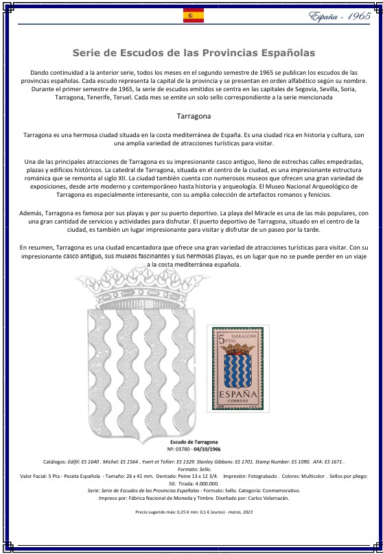 Ficha PDF para sellos – España 1965 Escudo de Tarragona · Catálogo Sooluciones ES‑1965‑03780