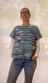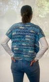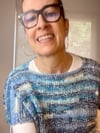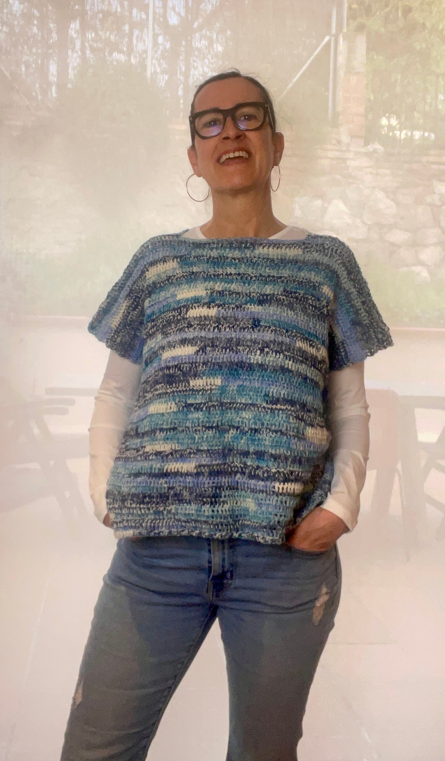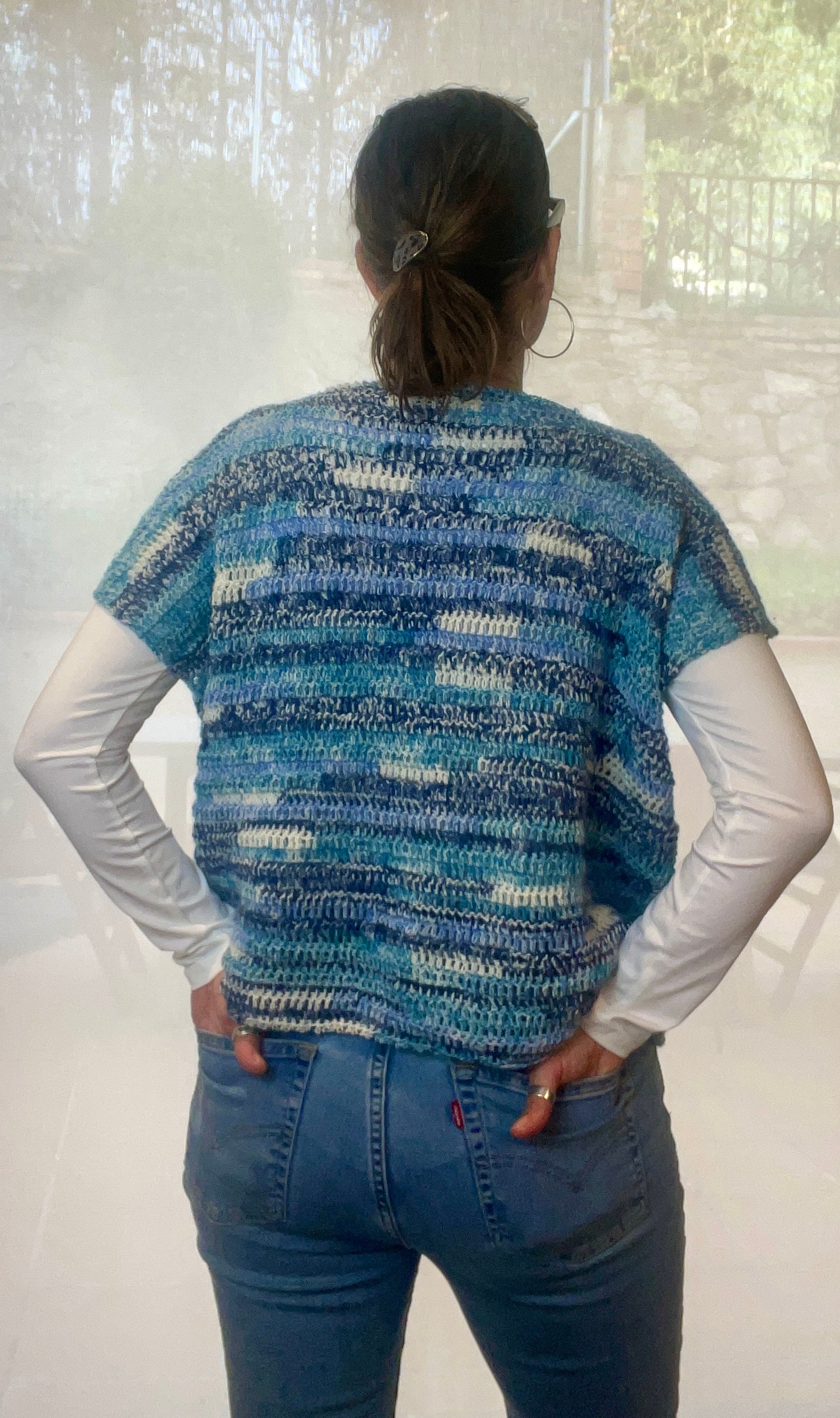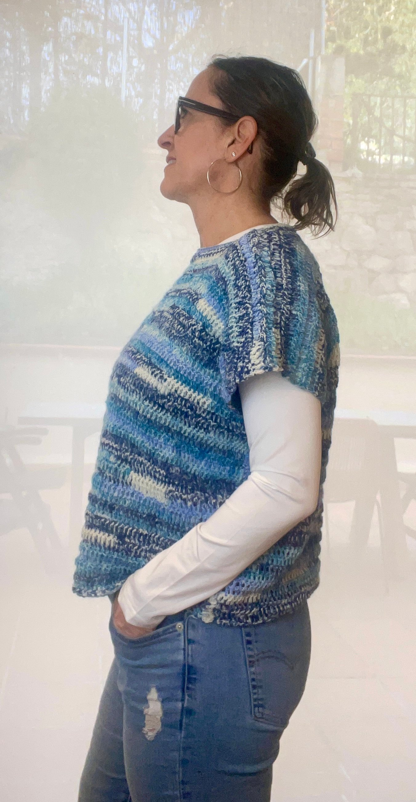 El Chaleco Jeans está tejido en una sola pieza con forma de T, y su diseño recuerda a una chaqueta abierta, sin cierres ni complicaciones. Ideal para tejer con hilos reciclados, vaqueros deshilados o lanas con textura.