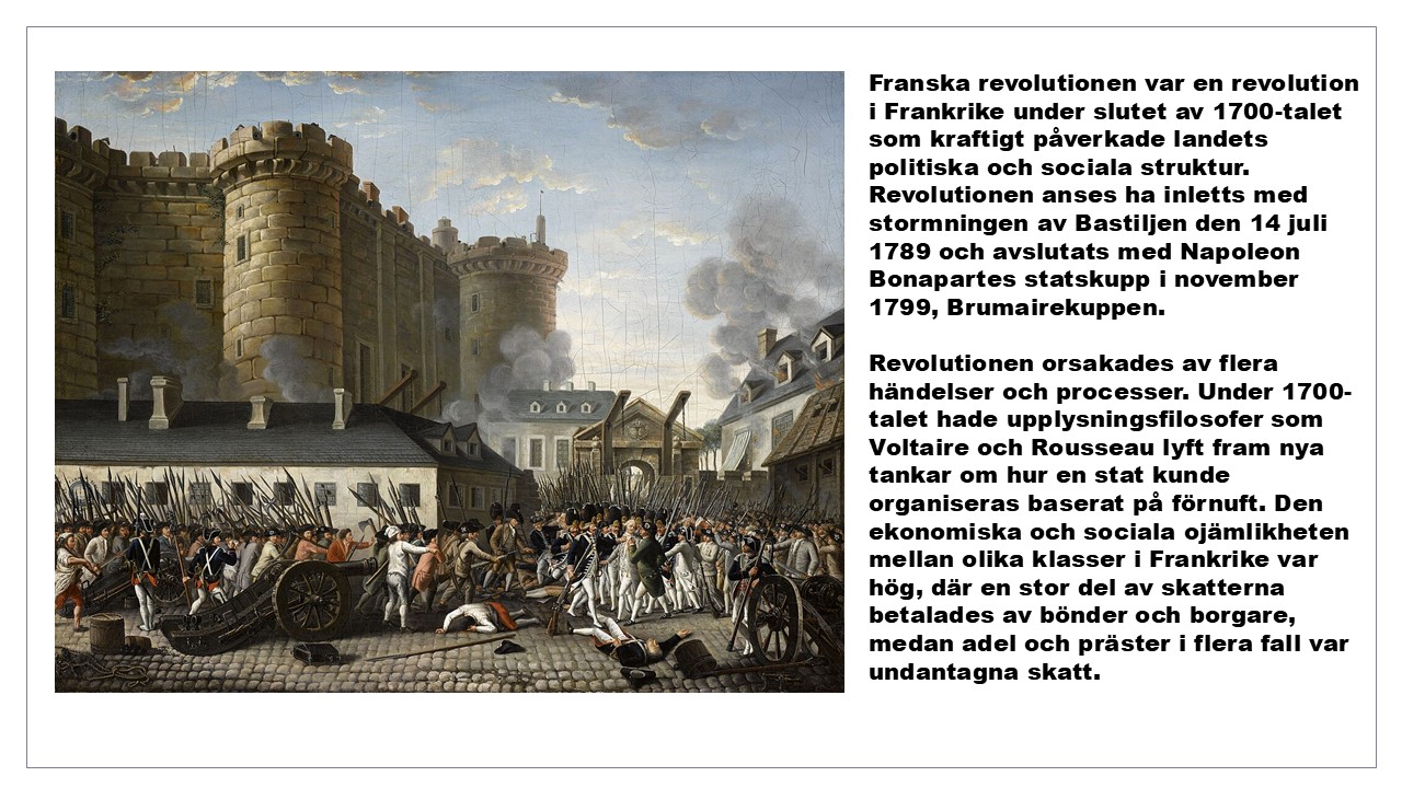 Franska revolutionen var en revolution i Frankrike under slutet av 1700-talet som kraftigt påverkade landets politiska och sociala struktur. Revolutionen anses ha inletts med stormningen av Bastiljen den 14 juli 1789 och avslutats med Napoleon Bonapartes statskupp i november 1799, Brumairekuppen.
