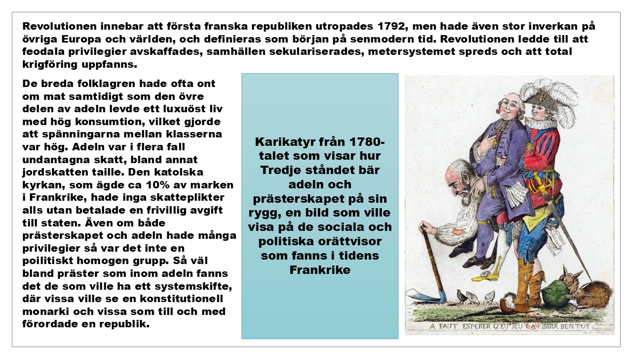 Revolutionen innebar att första franska republiken utropades 1792, men hade även stor inverkan på övriga Europa och världen, och definieras som början på senmodern tid. Revolutionen ledde till att feodala privilegier avskaffades, samhällen sekulariserades, metersystemet spreds och att total krigföring uppfanns.