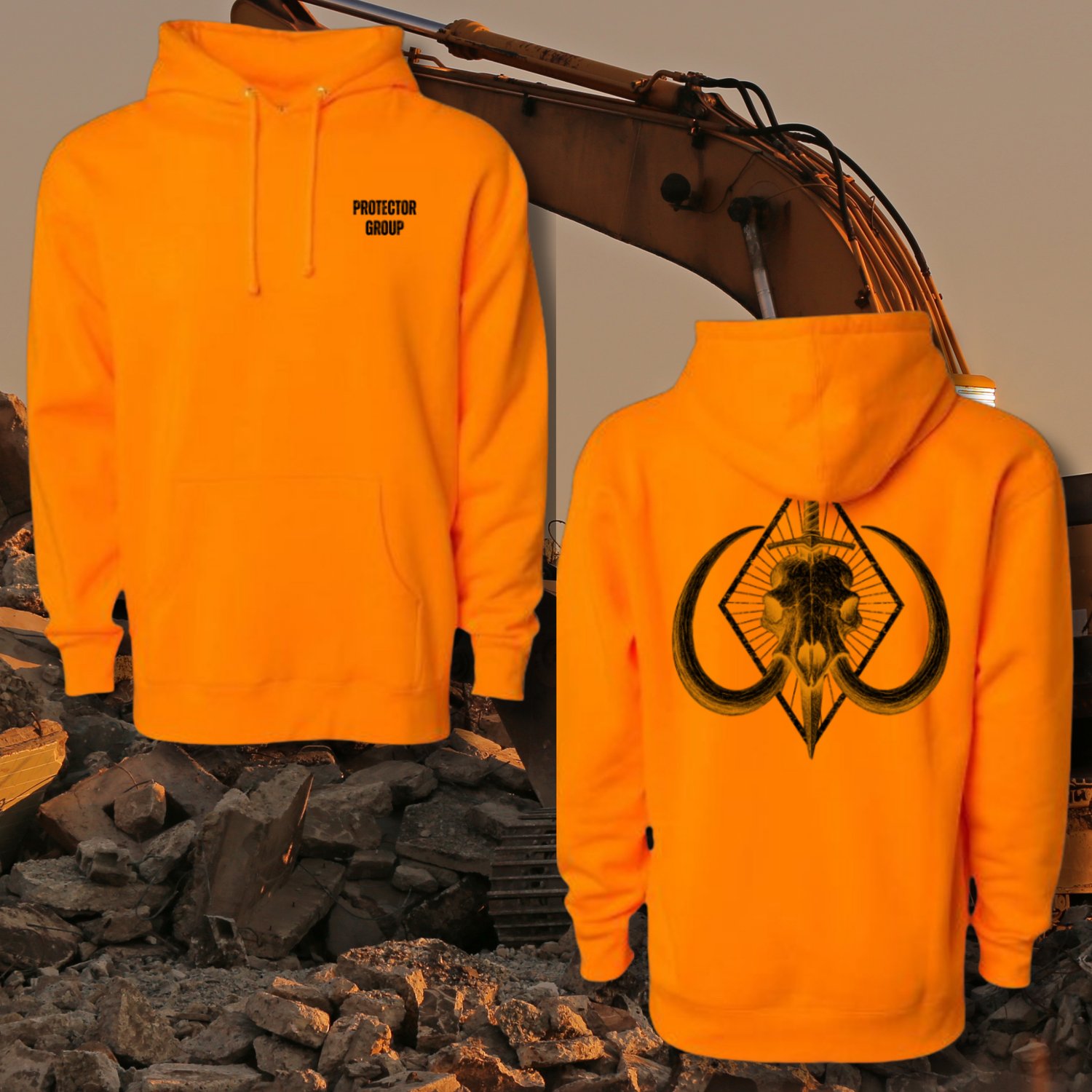 The Protector Group Mammoth 'Safety Orange' hoodie represents the core of Protector Group...fathers, protectors, and hardworking men who take responsibility for their families and the world around them.