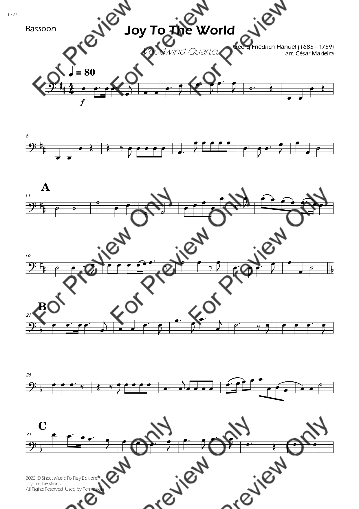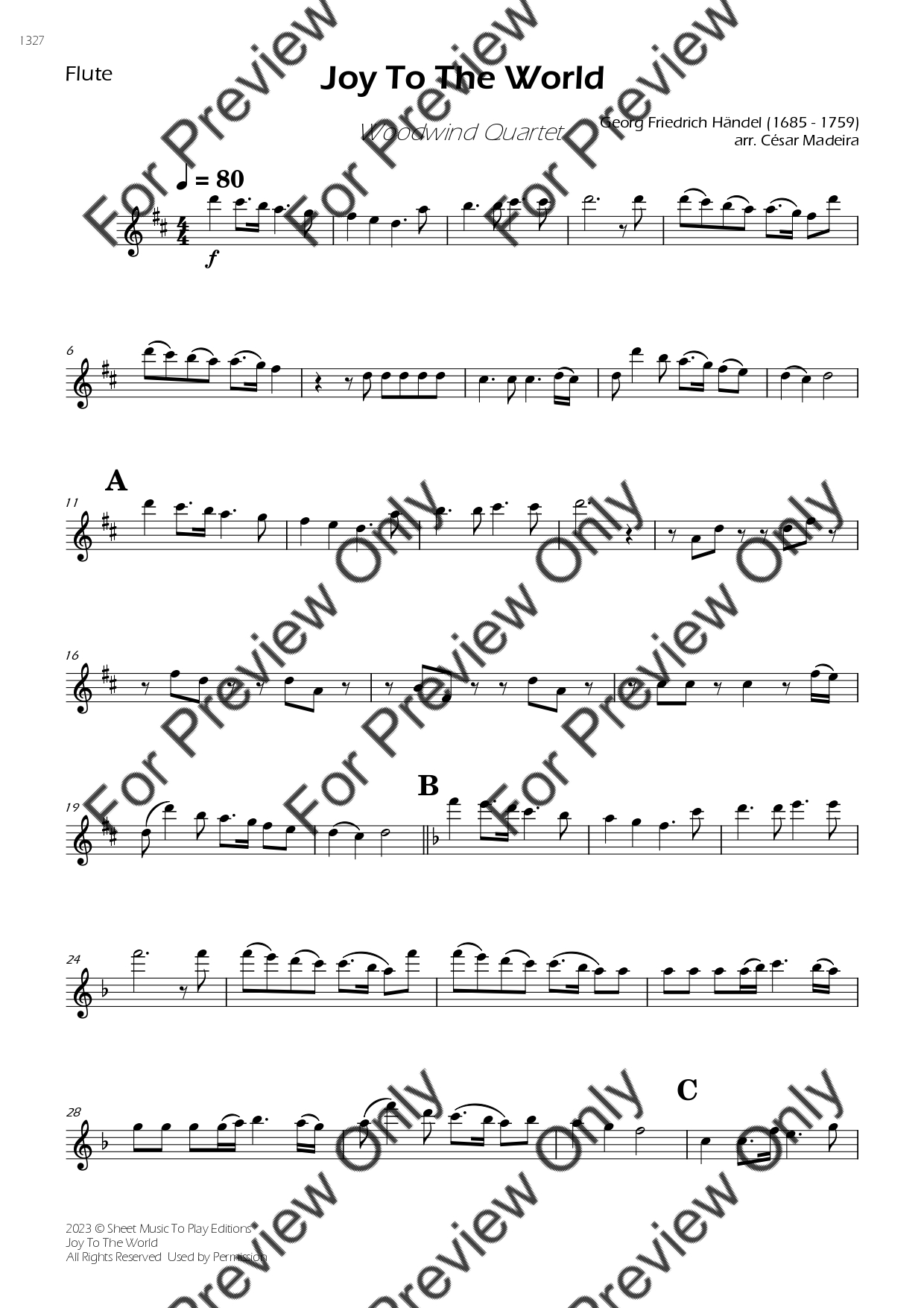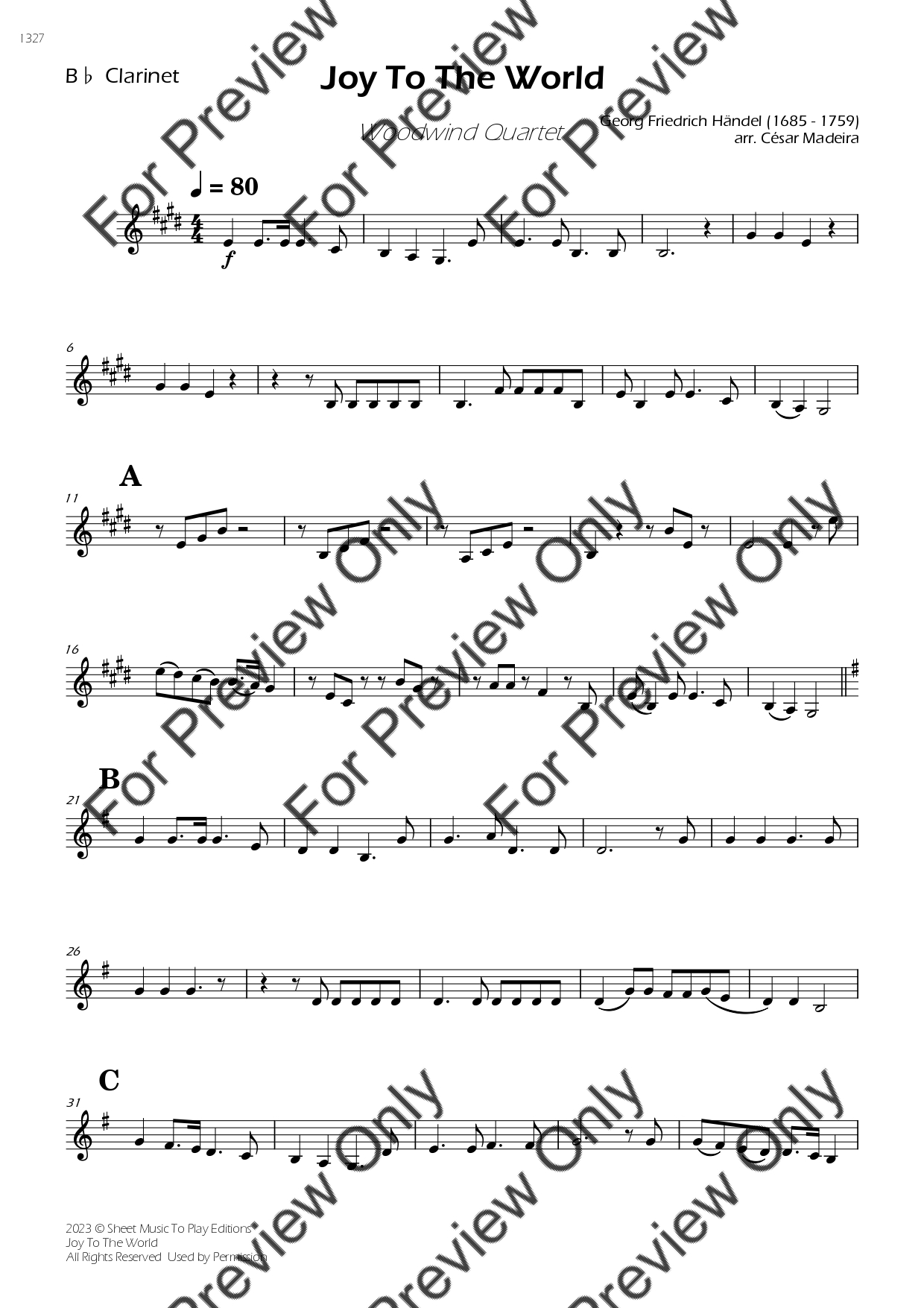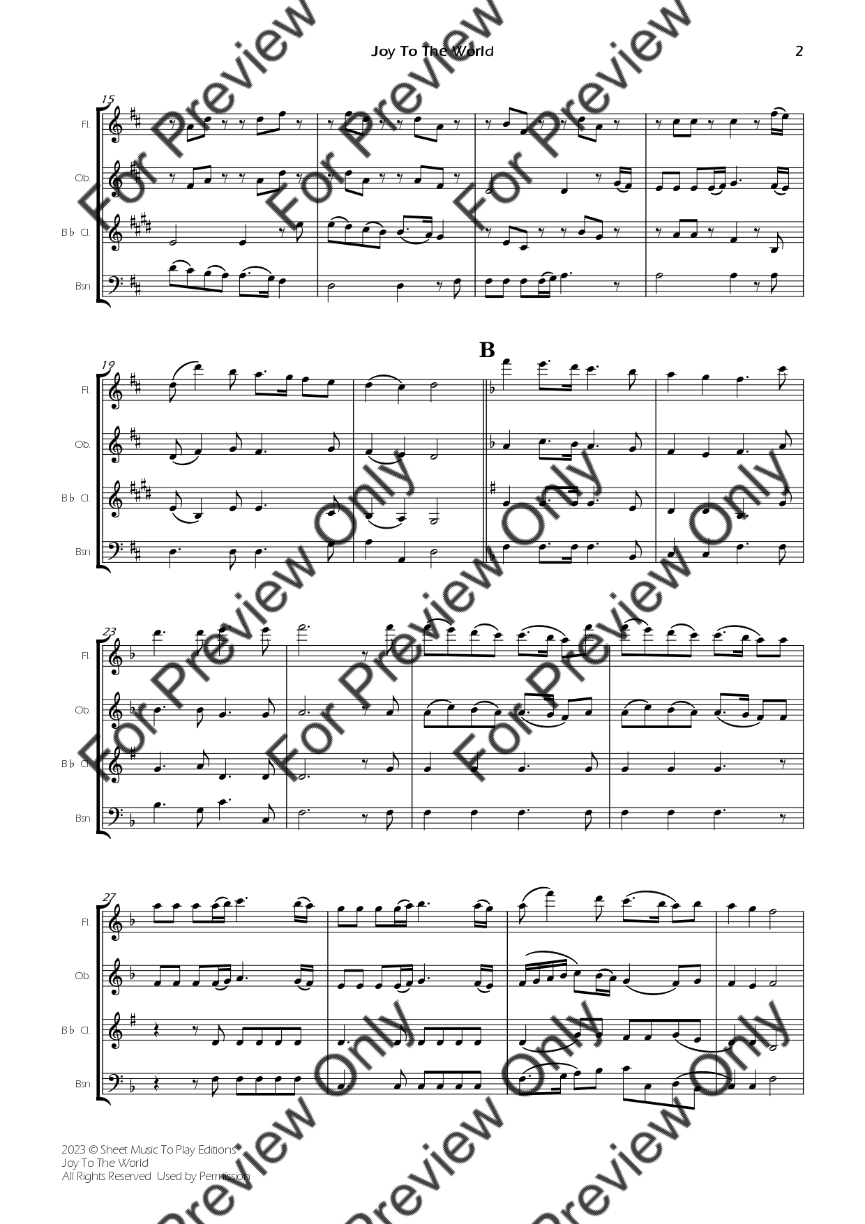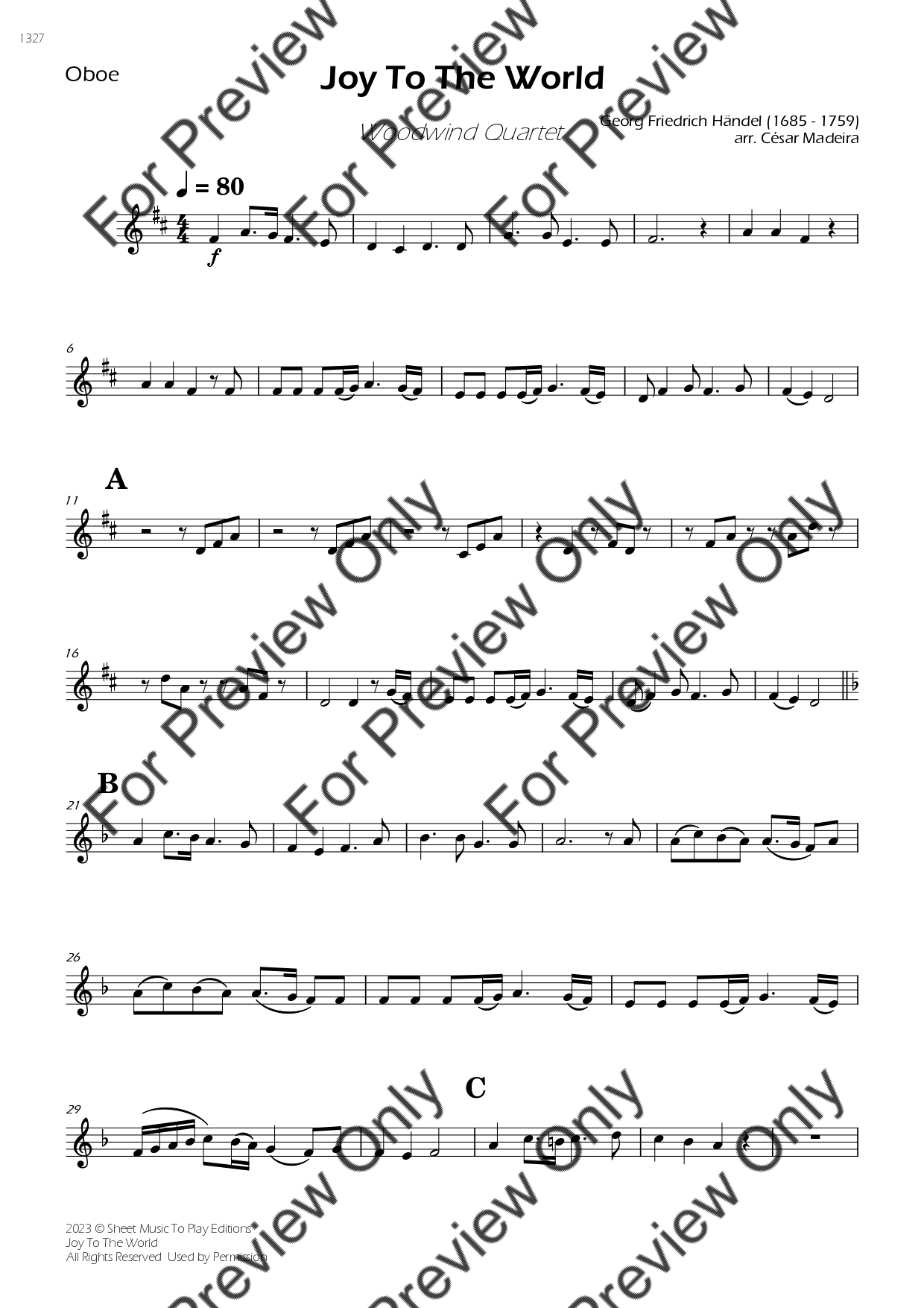 Joy To The World by Georg Friedrich Handel. Arrangement for Woodwind Quartet - Flute, Oboe, Bb Clarinet and Bassoon. With Full Score and Individual Parts. Have fun!