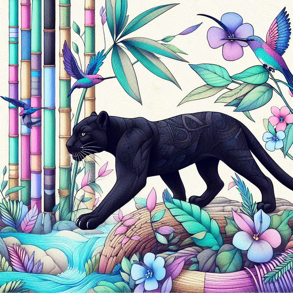 Black panther in a jungle with bamboo which is patterned around him & a tall colourful exotic plants & blue & purple flowers & little river. There are humming birds & a fallen tree.