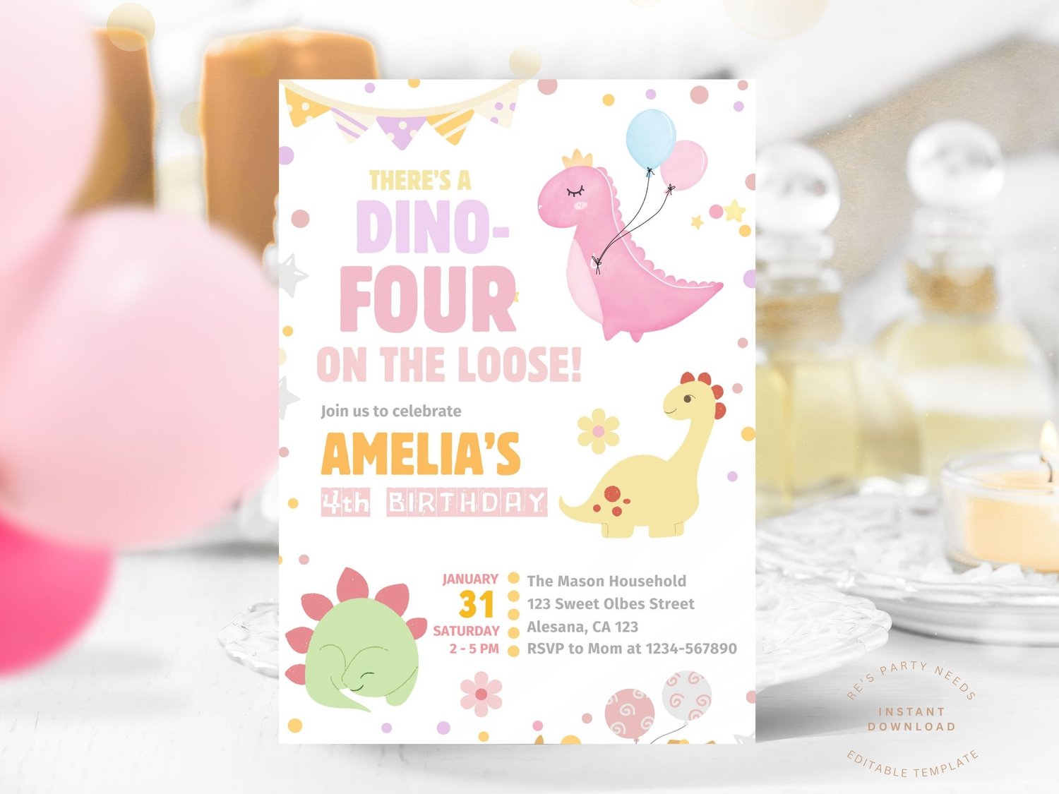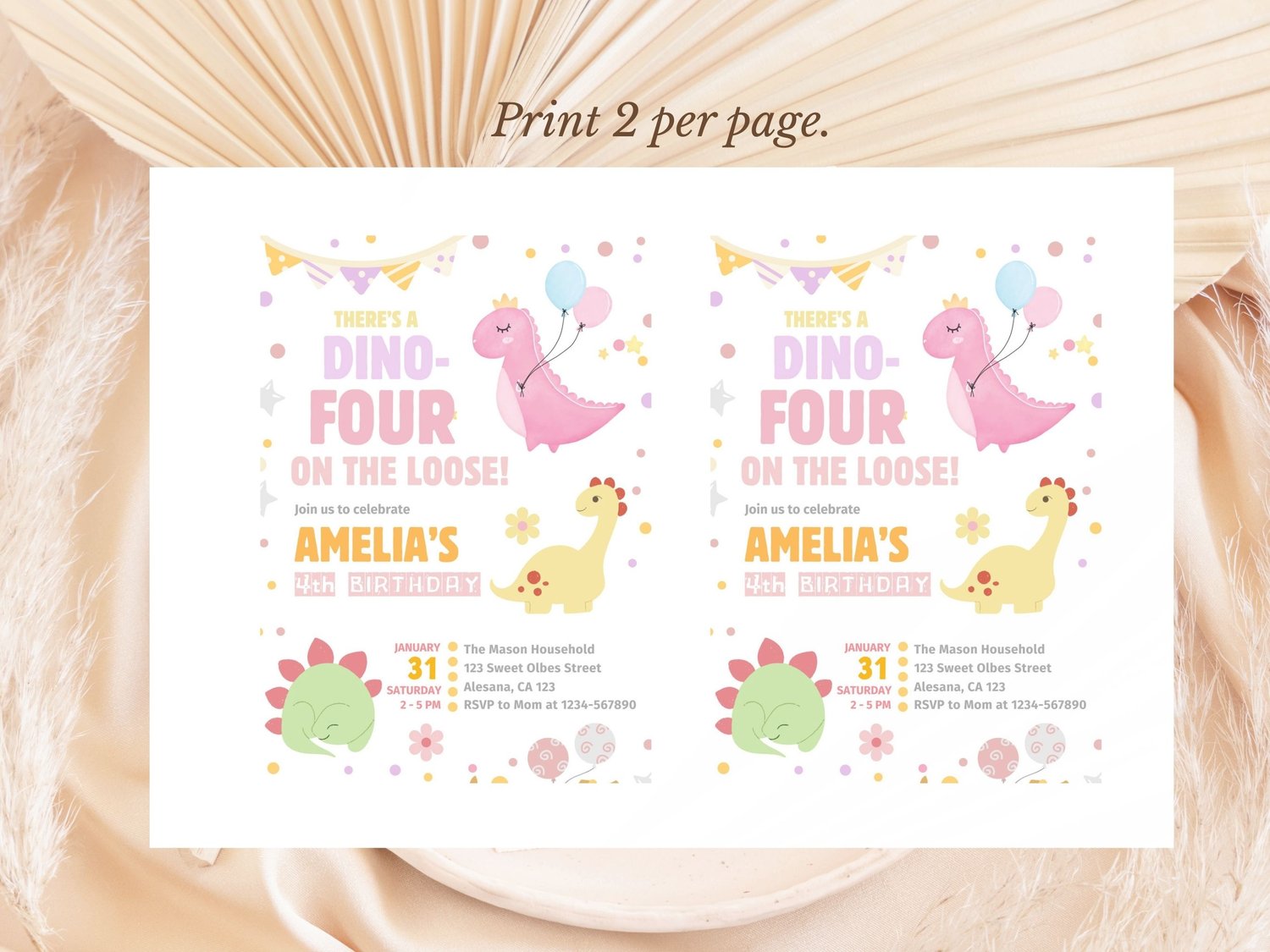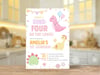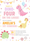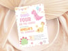 Dino Four Birthday Invitation, Pastel Pink Dinosaur 4th Birthday Party Invite Girl, Dino Four on the Loose, Editable Canva Digital Download