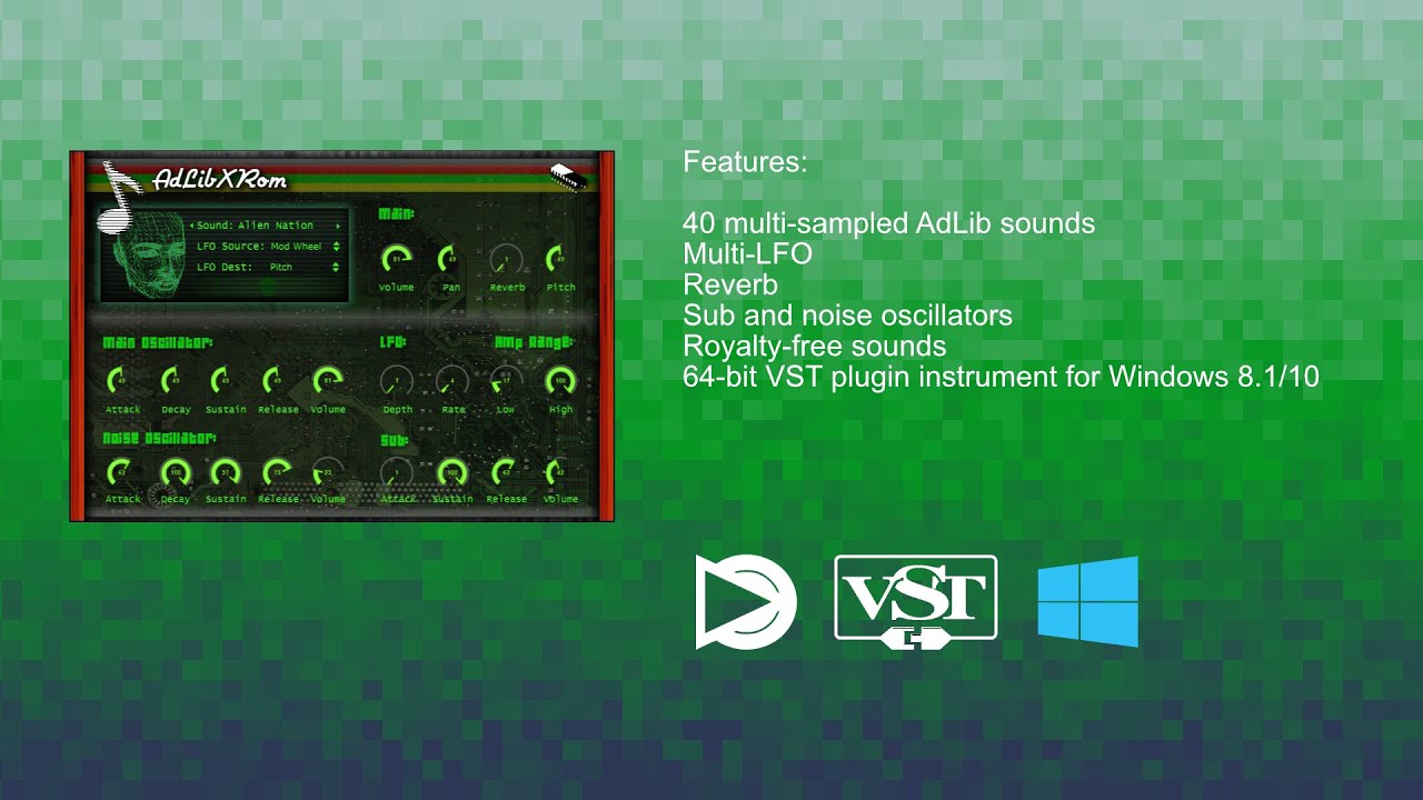 AdLibXRom is a plugin instrument featuring the sound of the AdLib Music Synthesizer Card. Famous in the early nineties for being widely used in PC computers, the AdLib soundcard had a synthesis chip built by Yamaha. This chip was the YM3812, an FM and additive synthesizer which had up to 9 channels of the digitally produced sound.