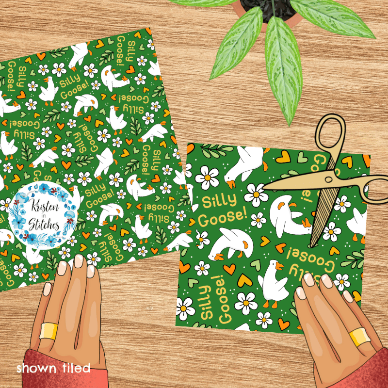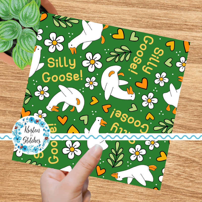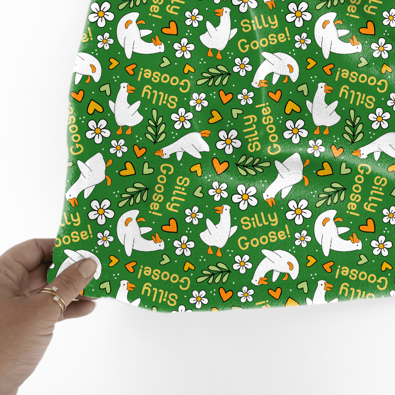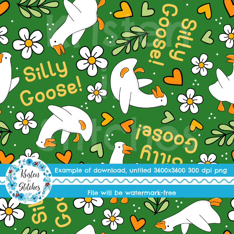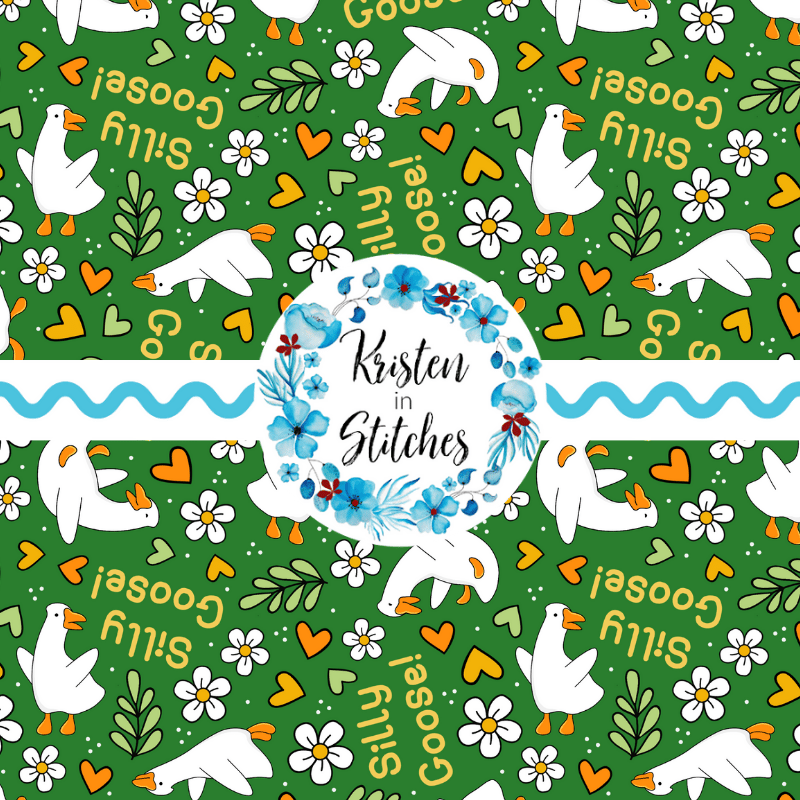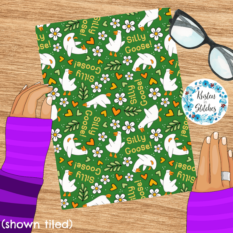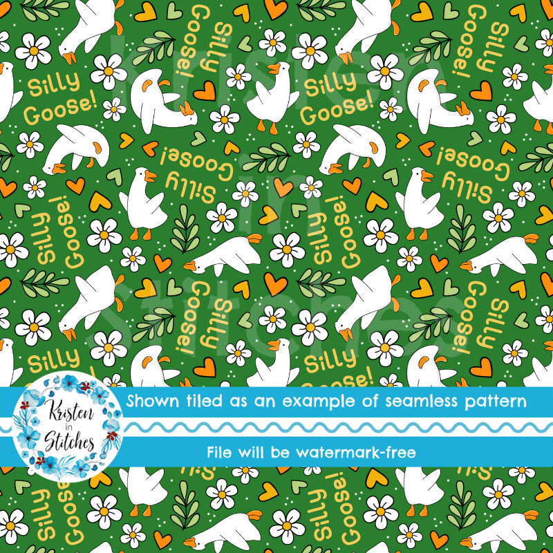Silly Goose Floral Seamless Pattern, White Geese on Green