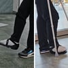 We can enjoy his white fiber cast while he stands in line for registering. His toes are covered with a white thin sock. But look at his shoe he is wearing on the other foot... Sock, shoes, long black pants...a great combination.