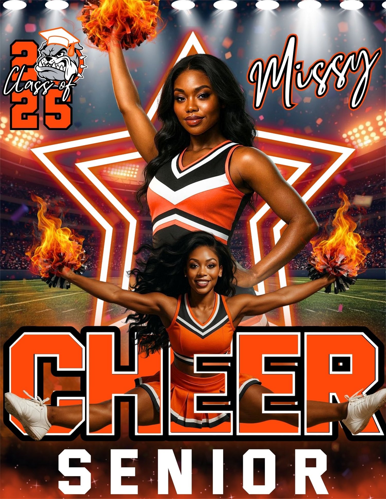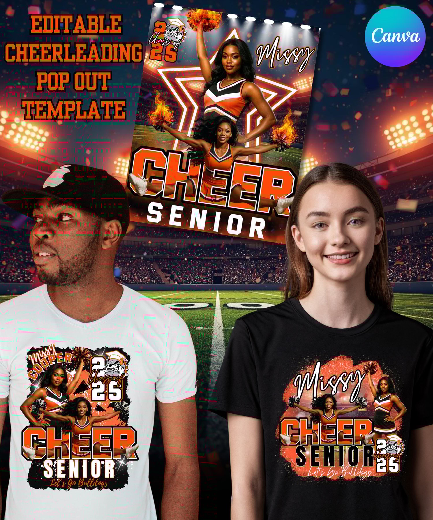 Celebrate your cheerleader’s big moment with this Editable Cheerleading Pop Out Template Bundle! Perfect for seniors, cheer squads, and proud families, this design set is bursting with bold graphics, fiery spirit, and customizable details that make every cheerleader shine.