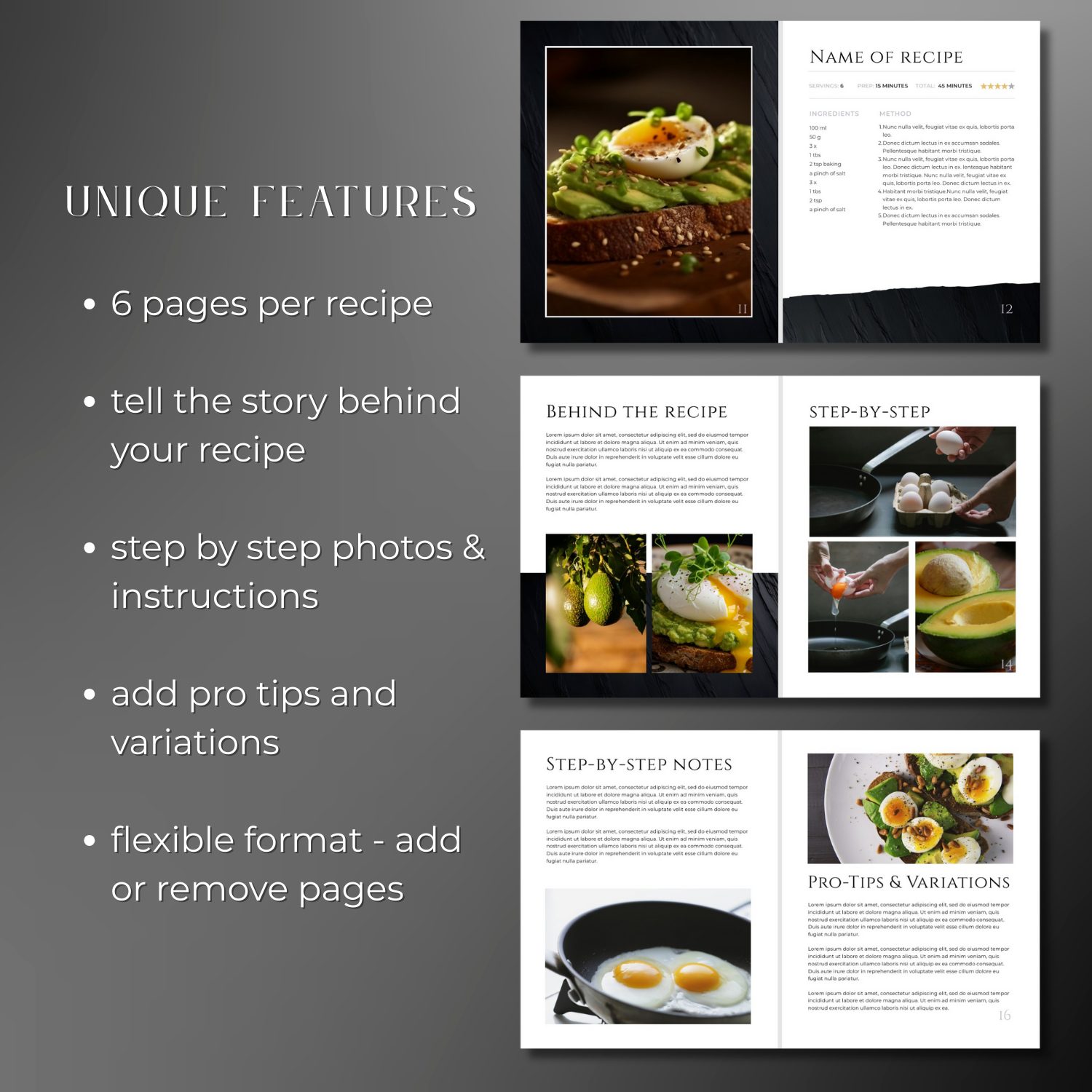 - 6 flexible pages to describe your recipe - tell the story behind your image, add step by step instructions, and include Pro Tips and Variations.