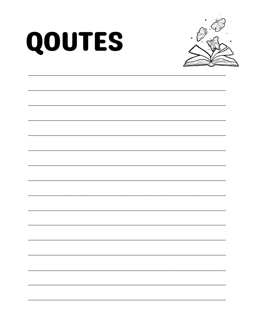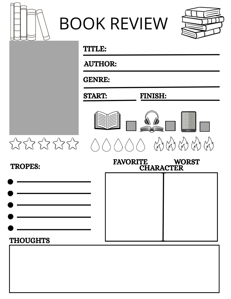 - Book Review – track title, author, dates read, genre, format, source, star rating, summary, character/plot/pacing breakdown, content notes, favorite quotes, and final thoughts.