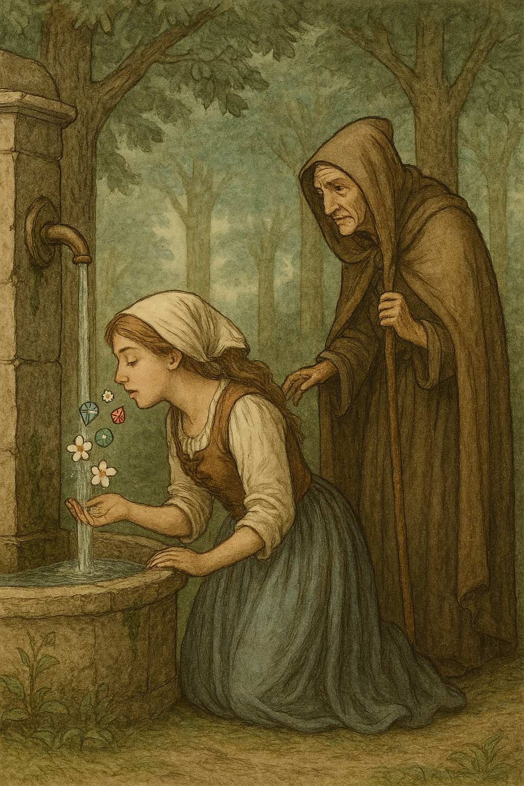 From The Fairy Tales of Charles Perrault collection comes The Fairy at the Fountain, a tender and magical illustration inspired by the tale often known as "Diamonds and Toads." In a moment of quiet kindness, the humble girl offers water to an old woman disguised as a fairy — and is blessed with diamonds and flowers falling from her lips.