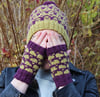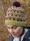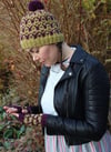 Both pieces of this accessory set are worked in the round. The mitts begin with the cuff, with stitches set aside on waste yarn added halfway through the colourwork patterning for an afterthought thumb, which is worked in rib after the main mitt is complete. The hat is worked from the brim up to the crown. To help you make the most of your yarn, the main colour and contrast colours are switched between the mitts and the hat.