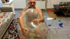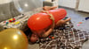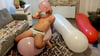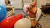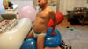 In this video dady Laurent blow and burst small balloons while ridind and bursting giant ones.