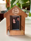 Gingerbread House frame ornament for 1 1/2" x 2 1/2" photo, with gingerbread man and marshmallow snowman, chocolate window and door trim and cookie steps and plaque above doorway!