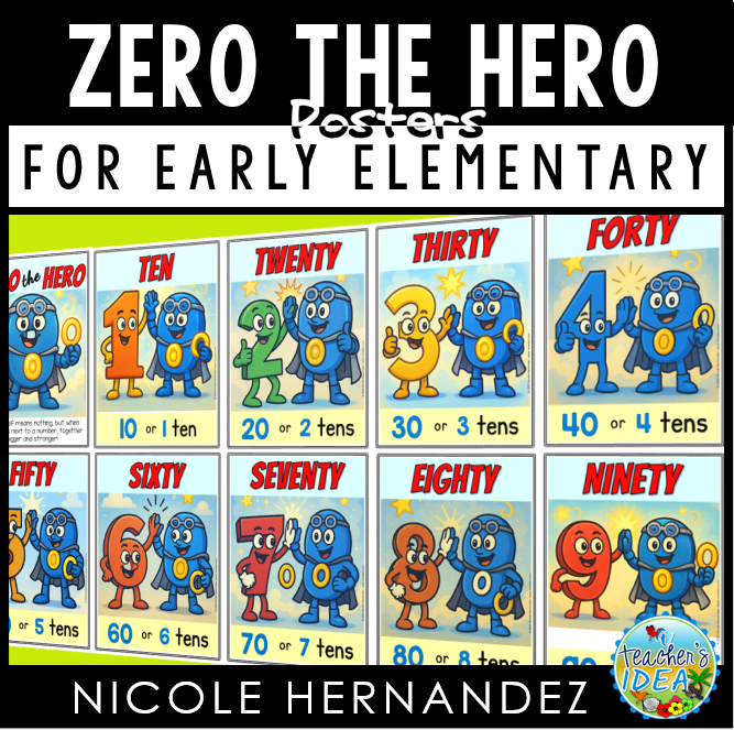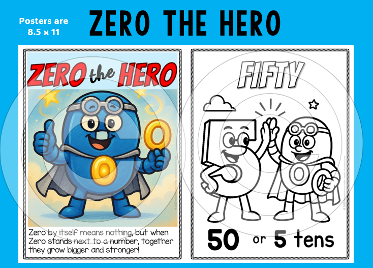 Each full-color poster features Zero the Hero teaming up with a friendly number to form the tens (e.g., 10, 20, 30...), along with the expanded form ("30 or 3 tens"). Matching black and white versions are included for student coloring, interactive notebooks, and printable mini-books.