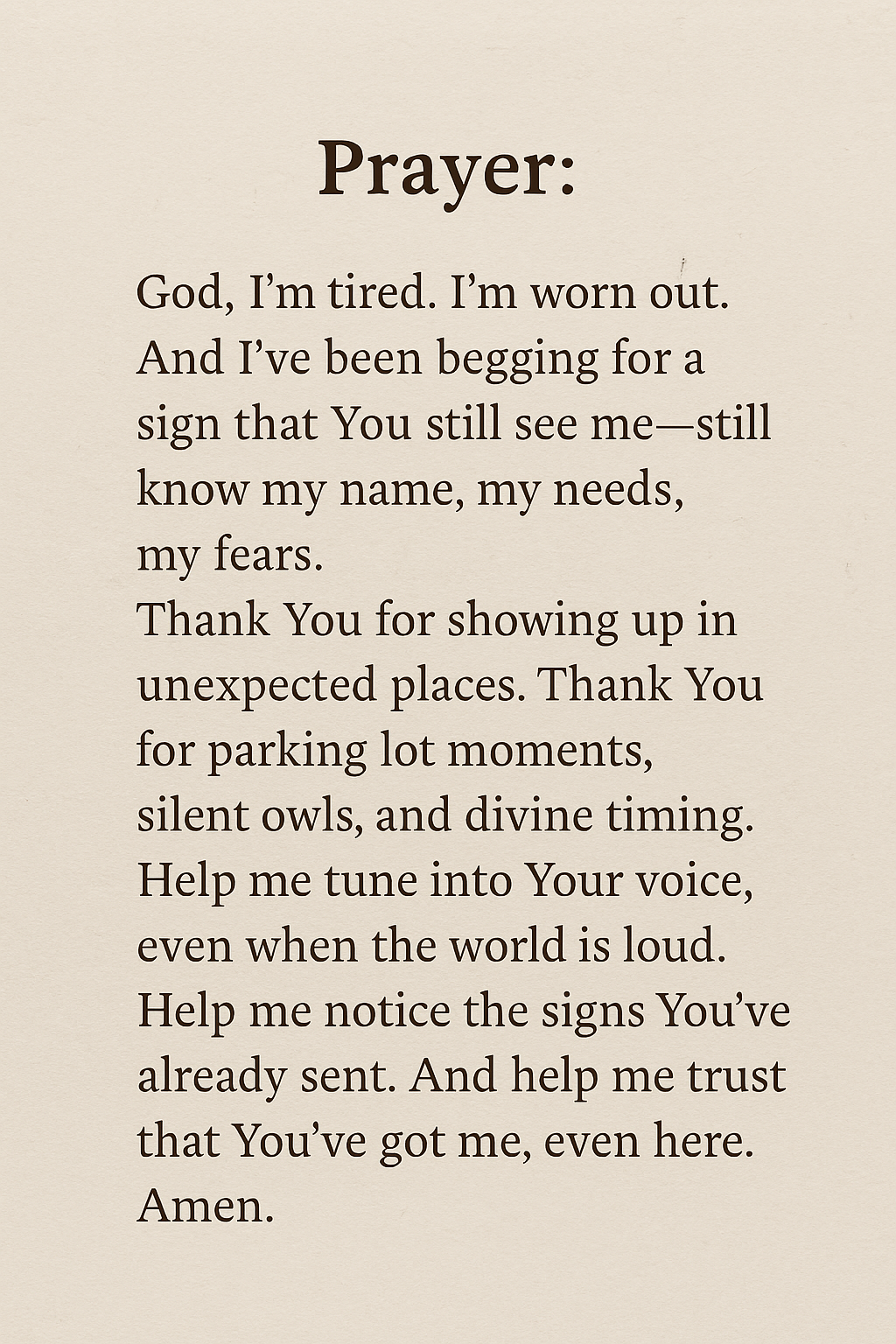 This printable devotional was created from a real-life moment of divine interruption—a tired mama dropping her kid off at work, feeling emotionally done, and begging for a sign. Then an owl showed up. Not in a dream. Not in a verse. But perched high on a Braum’s sign, bold and unbothered. That was her sign—and this is the devotional born from it.