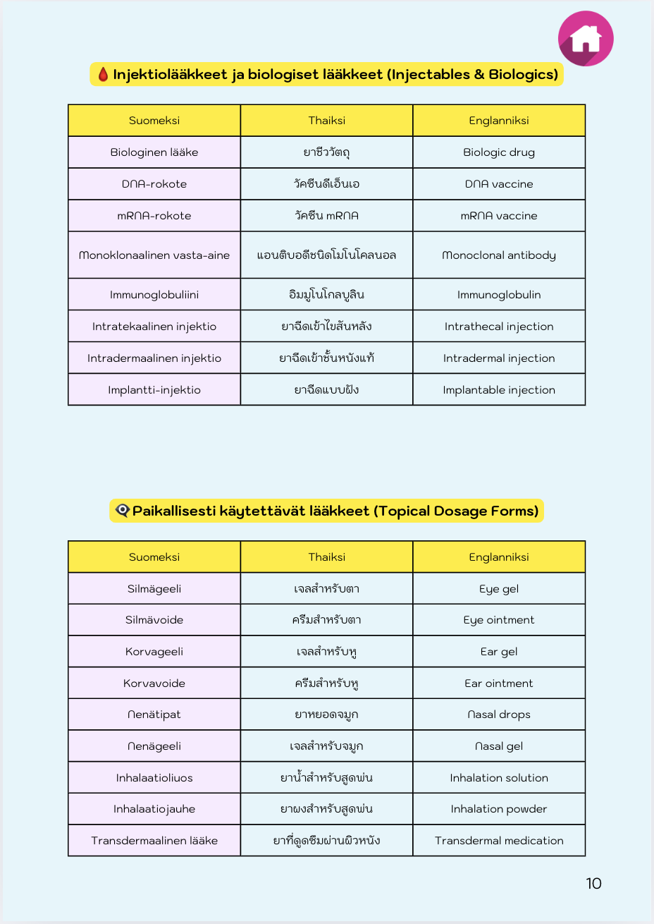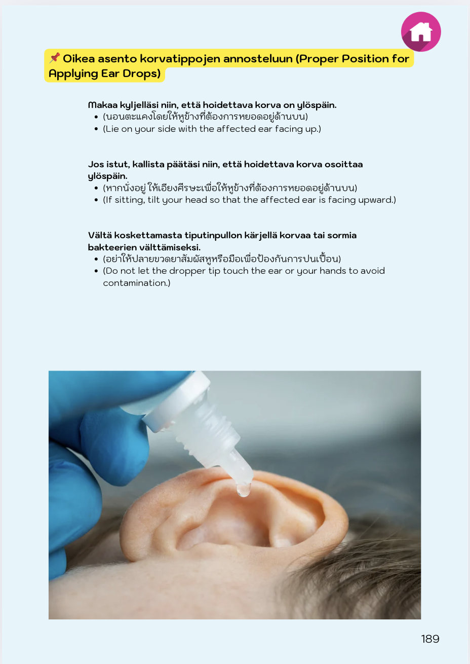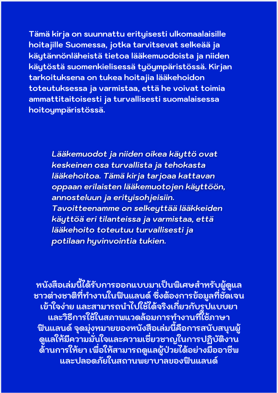 หนังสือเล่มนี้ได้รับการออกแบบมาเป็นพิเศษสำหรับผู้ดูแลชาวต่างชาติที่ทำงานในฟินแลนด์ ซึ่งต้องการข้อมูลที่ชัดเจน เข้าใจง่าย และสามารถนำไปใช้ได้จริงเกี่ยวกับรูปแบบยาและวิธีการใช้ในสภาพแวดล้อมการทำงานที่ใช้ภาษาฟินแลนด์ จุดมุ่งหมายของหนังสือเล่มนี้คือการสนับสนุนผู้ดูแลให้มีความมั่นใจและความเชี่ยวชาญในการปฏิบัติงานด้านการให้ยา เพื่อให้สามารถดูแลผู้ป่วยได้อย่างมืออาชีพและปลอดภัยในสถานพยาบาลของฟินแลนด์
