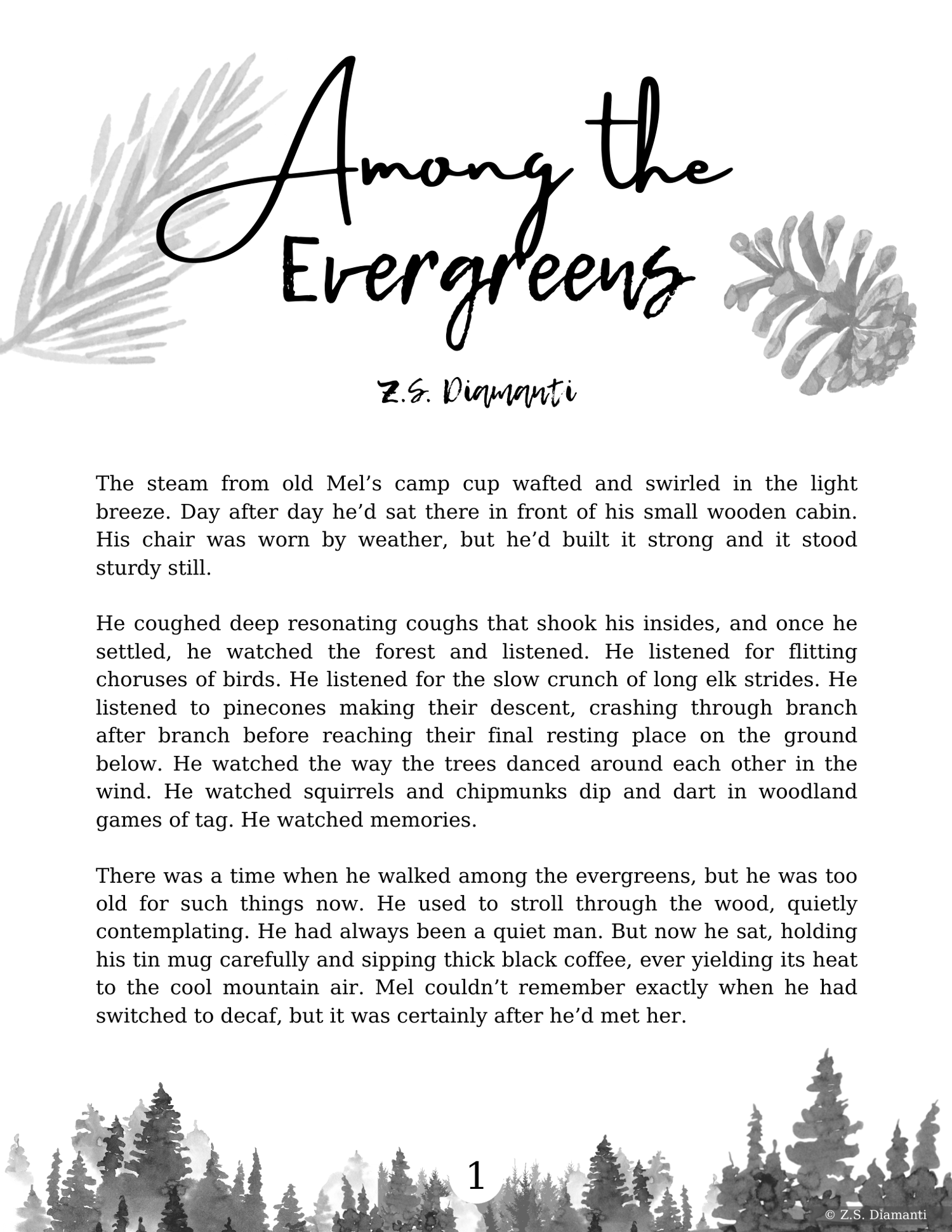 "They walked among the evergreens, breathing and feeling the presence of the giants around them. These giants were strong, and even after hundreds of years they stood sturdy still."
